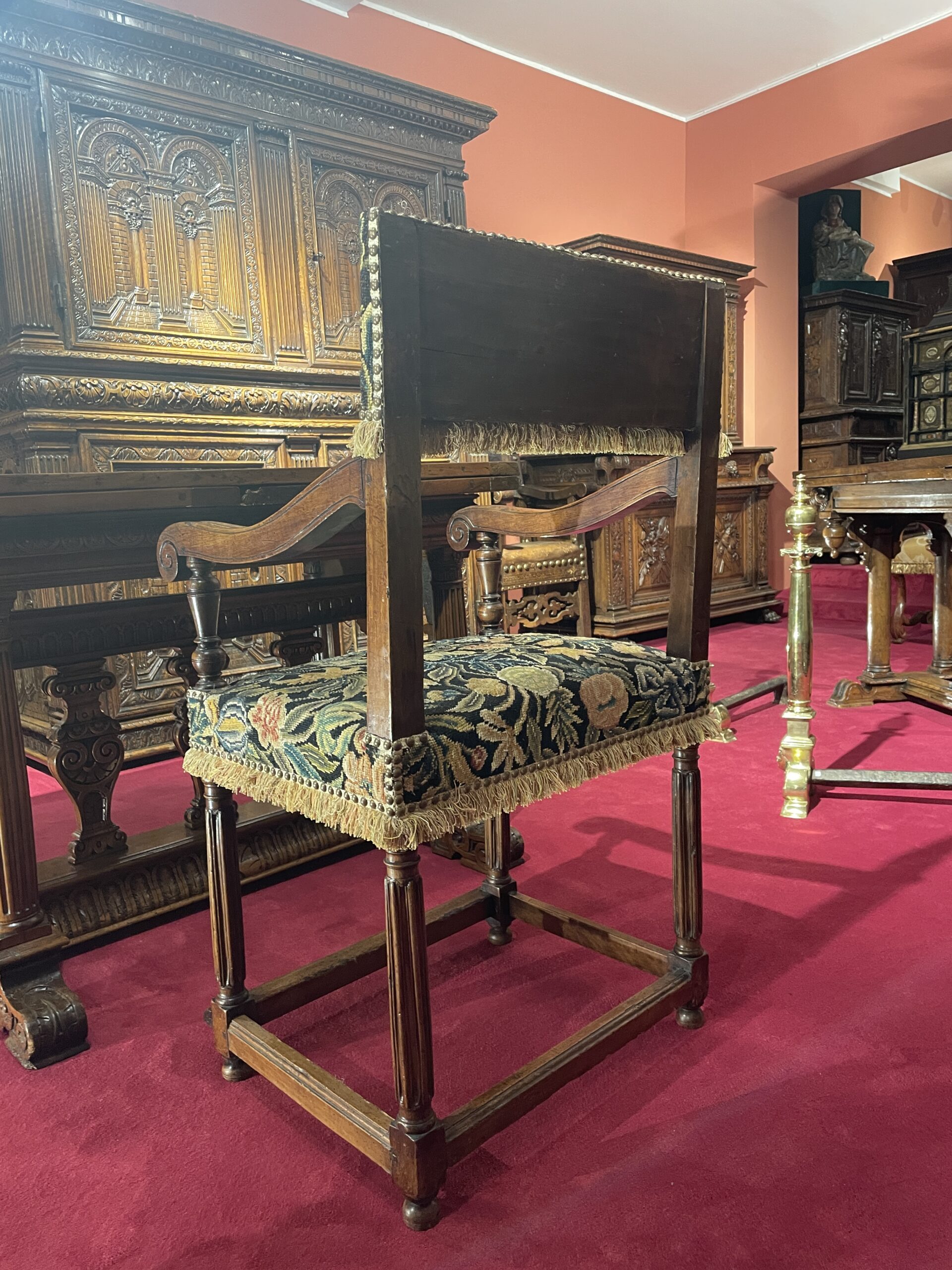 Cette chaise à bras inspire par la qualité de ses proportions, une impression de siège d’apparat. Pur siège d’époque Henri II, il répond au goût d’une époque où la grâce et la mesure se conjuguent à la majesté.