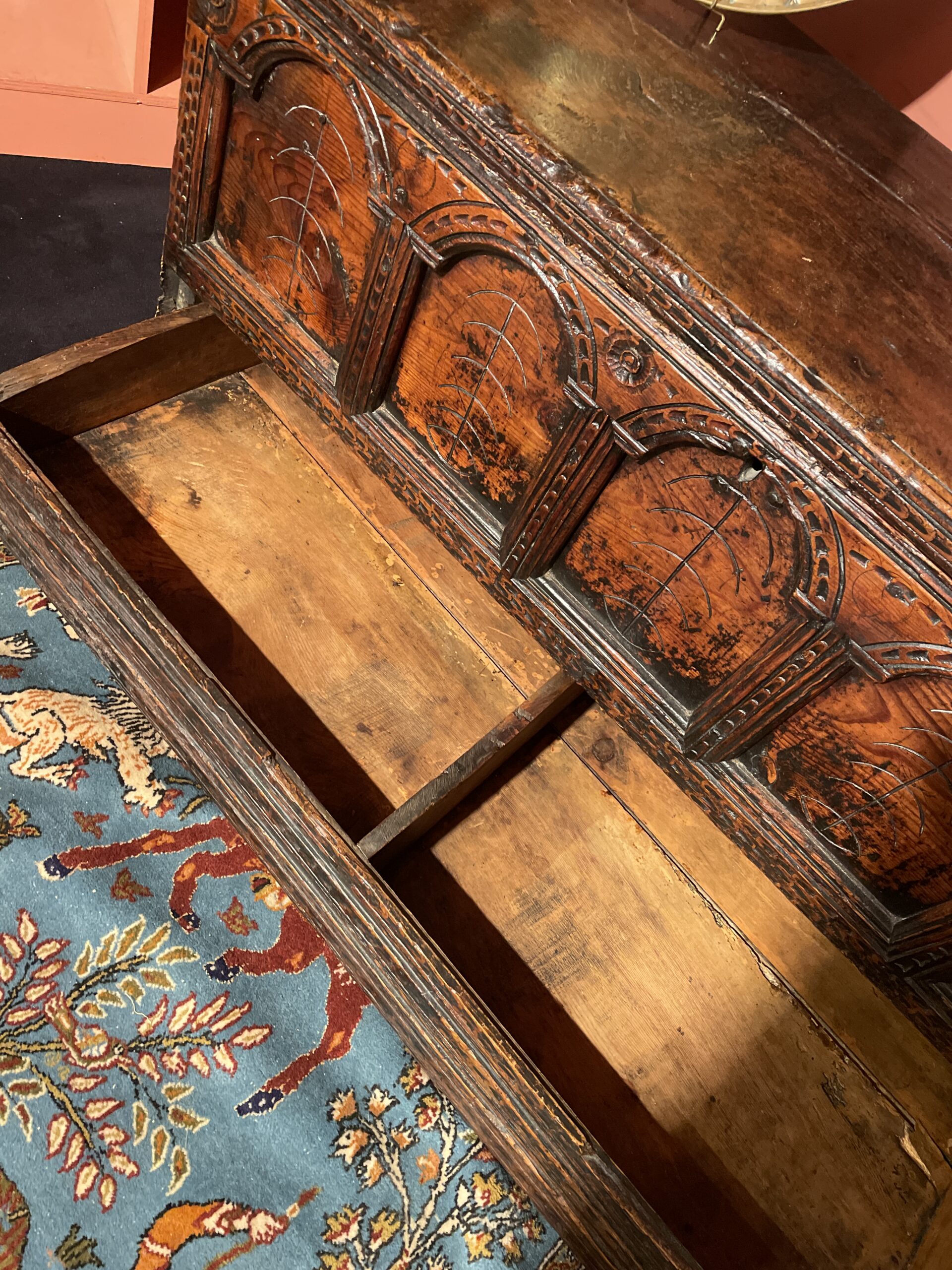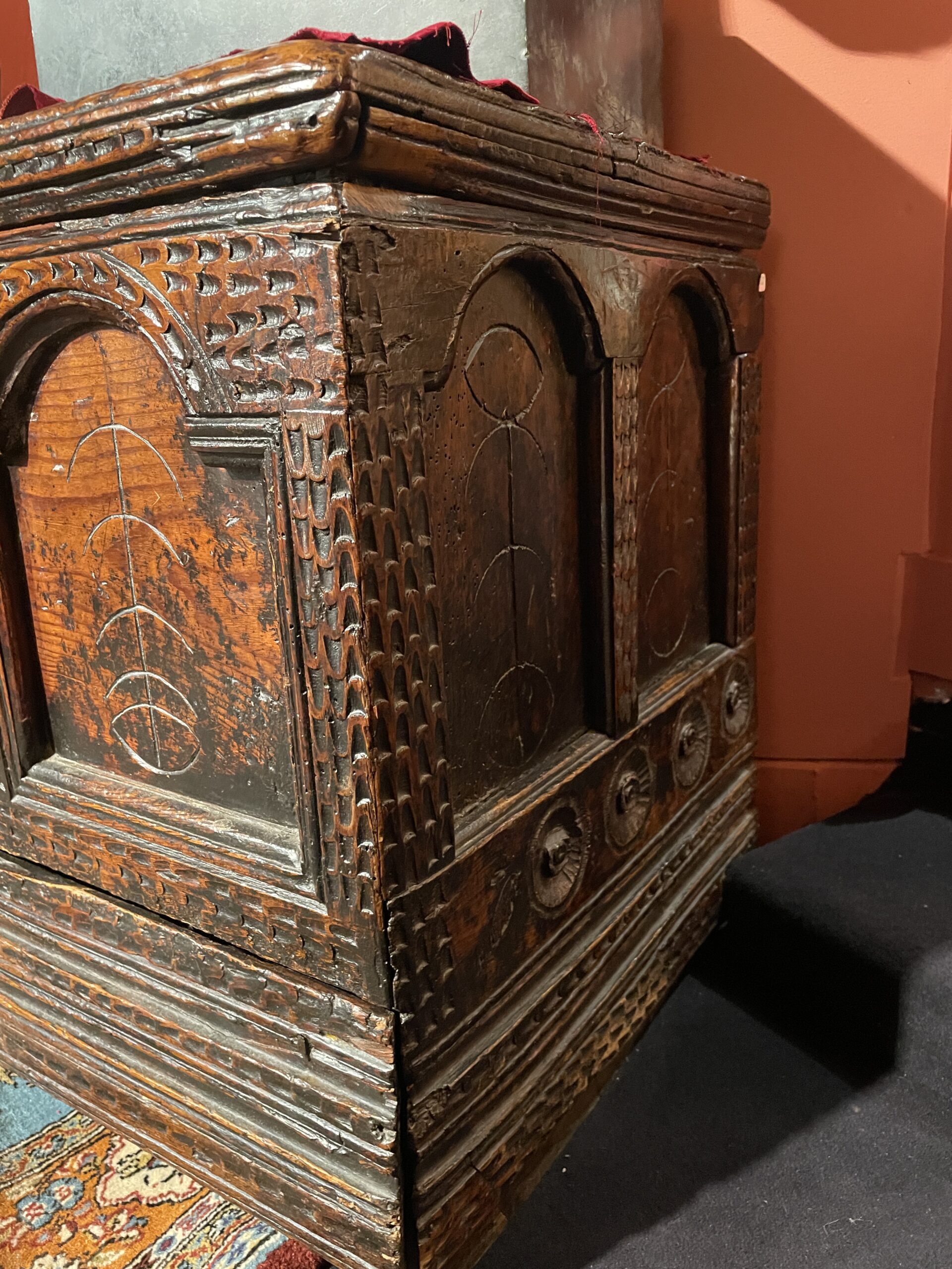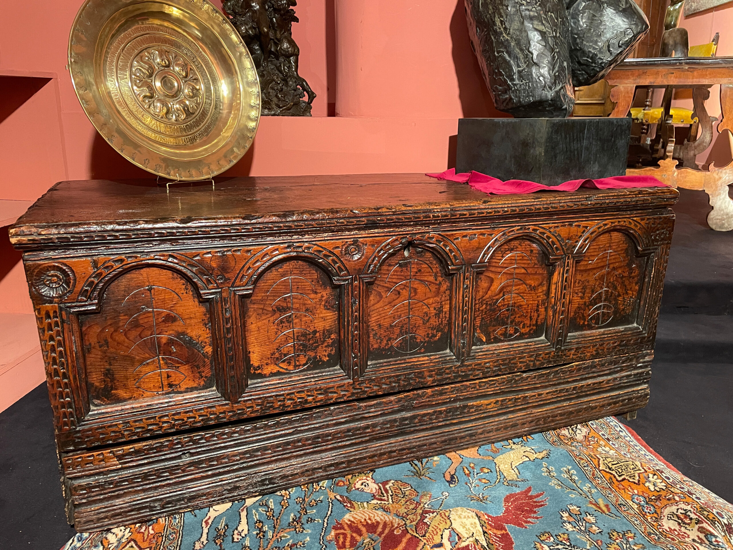 En soubassement, un tiroir est dissimulé derrière une suite de quatre frises moulurées des plus ornées, décorées de stries réalisées à la gouge et au ciseau. Dessus, cinq arcs surbaissés reposant sur des pilastres moulurés, encadrent chacun un arbre stylisé. Ce même décor se poursuit sur les parties latérales du coffre.