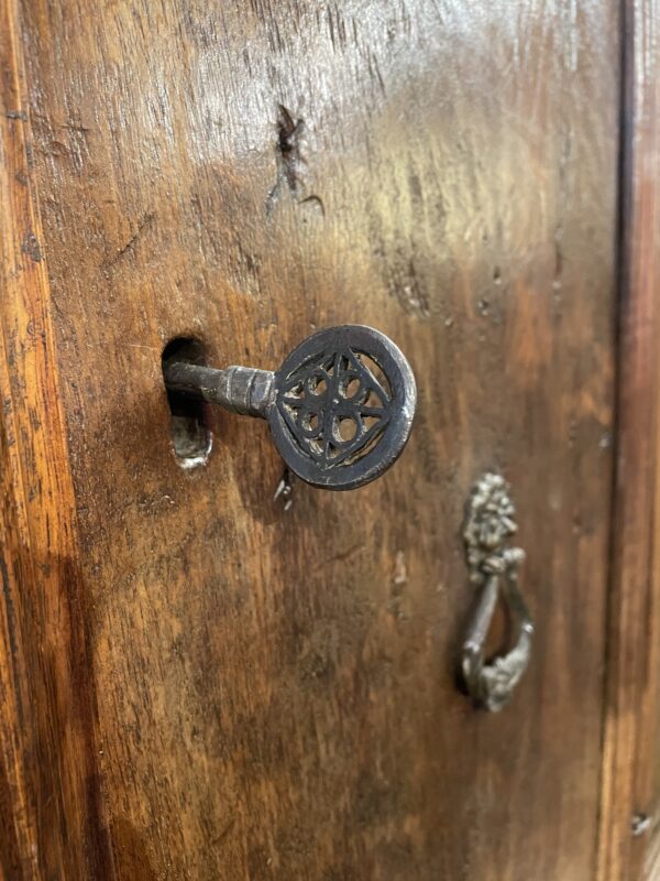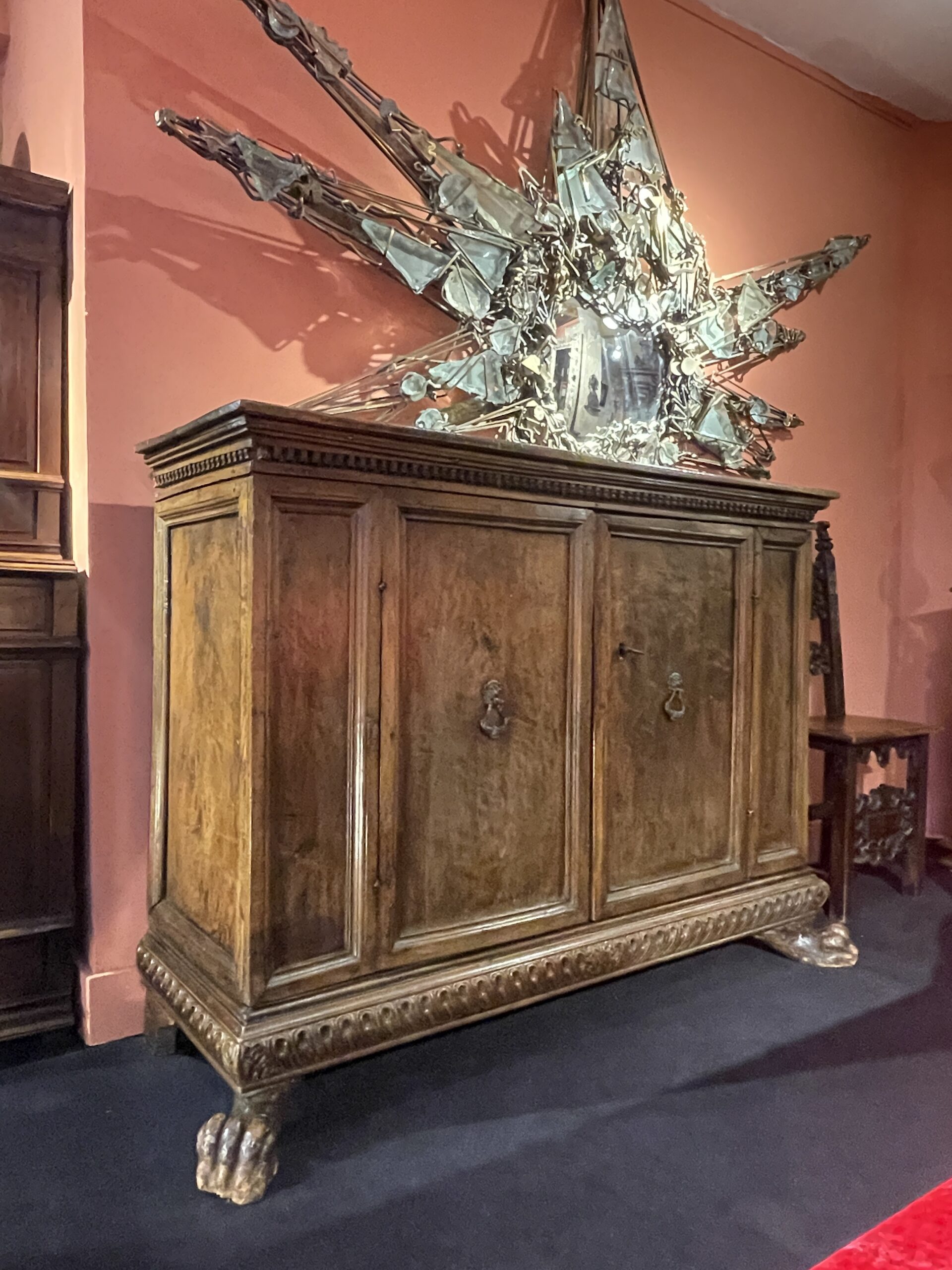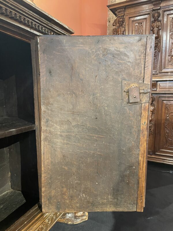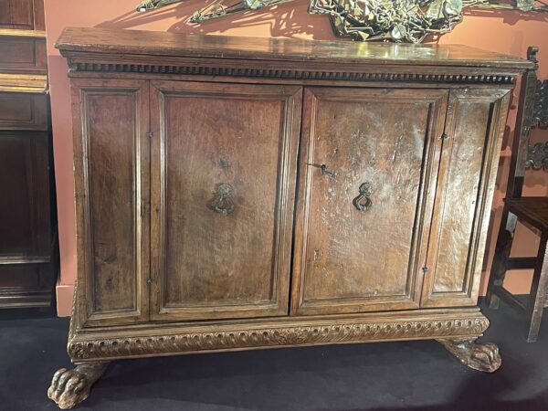 La « credenza » est un meuble typique de l’Italie. Elle dérive au cours du XV ème siècle d’une forme antérieure, table munie de gradins à fonction d’apparat, qui joue un rôle dans le cérémonial des milieux raffinés. Transformée en armoire basse à deux portes, elle est munie de serrures et de clés pour protéger un contenu précieux. Parfois de petite taille, elle convient pour les chambres à coucher ou les petites salles à manger devenues à la mode dès le Quattrocento.