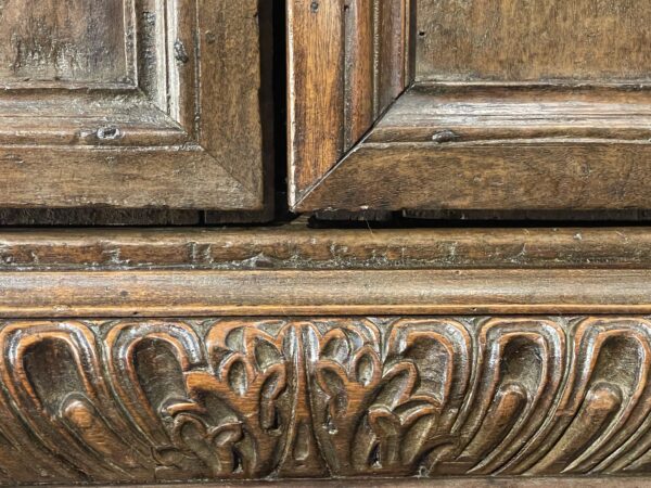 La Crédence que nous présentons ici est une crédence de Palais. Imposante par sa taille, la sobriété est ici facteur d’élégance, jouant de la teinte et de la veine du bois ainsi que des reliefs obtenus par décaissement du bâti des panneaux.