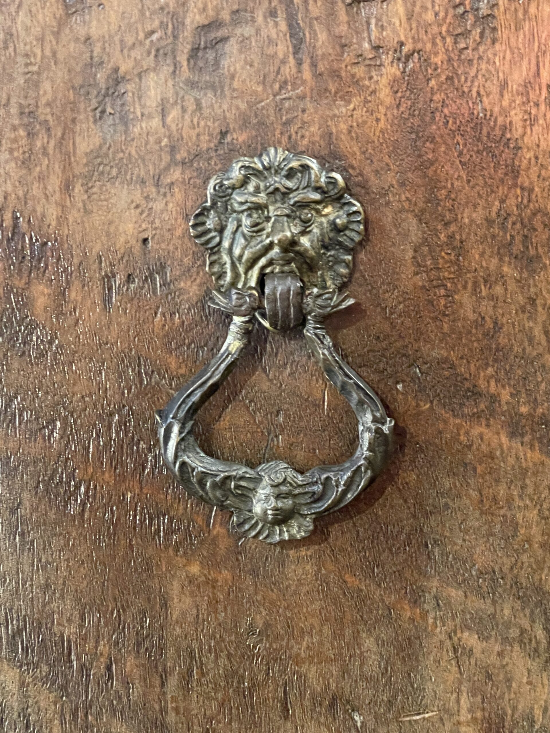 Le centre des vantaux est orné par une prise de serrure en bronze sculpté de tête de lion et un pendeloque formant une tête de putti.