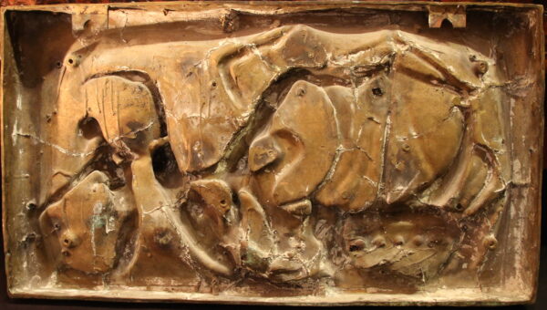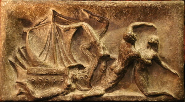 Sur cette plaque est figuré à gauche un bateau à voile et des personnages nus qui semblent figurer par leur traitement des sirènes bien que ces femmes n’aient pas une queue de poisson. Des trois femmes figurées l’une nage la deuxième semble plonger du ciel, la troisième se laisse enlacer par un homme.