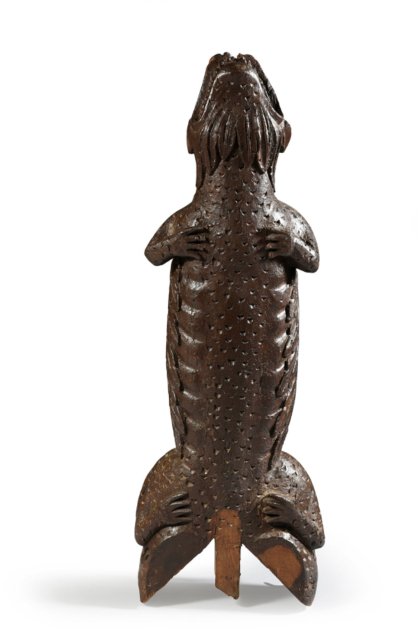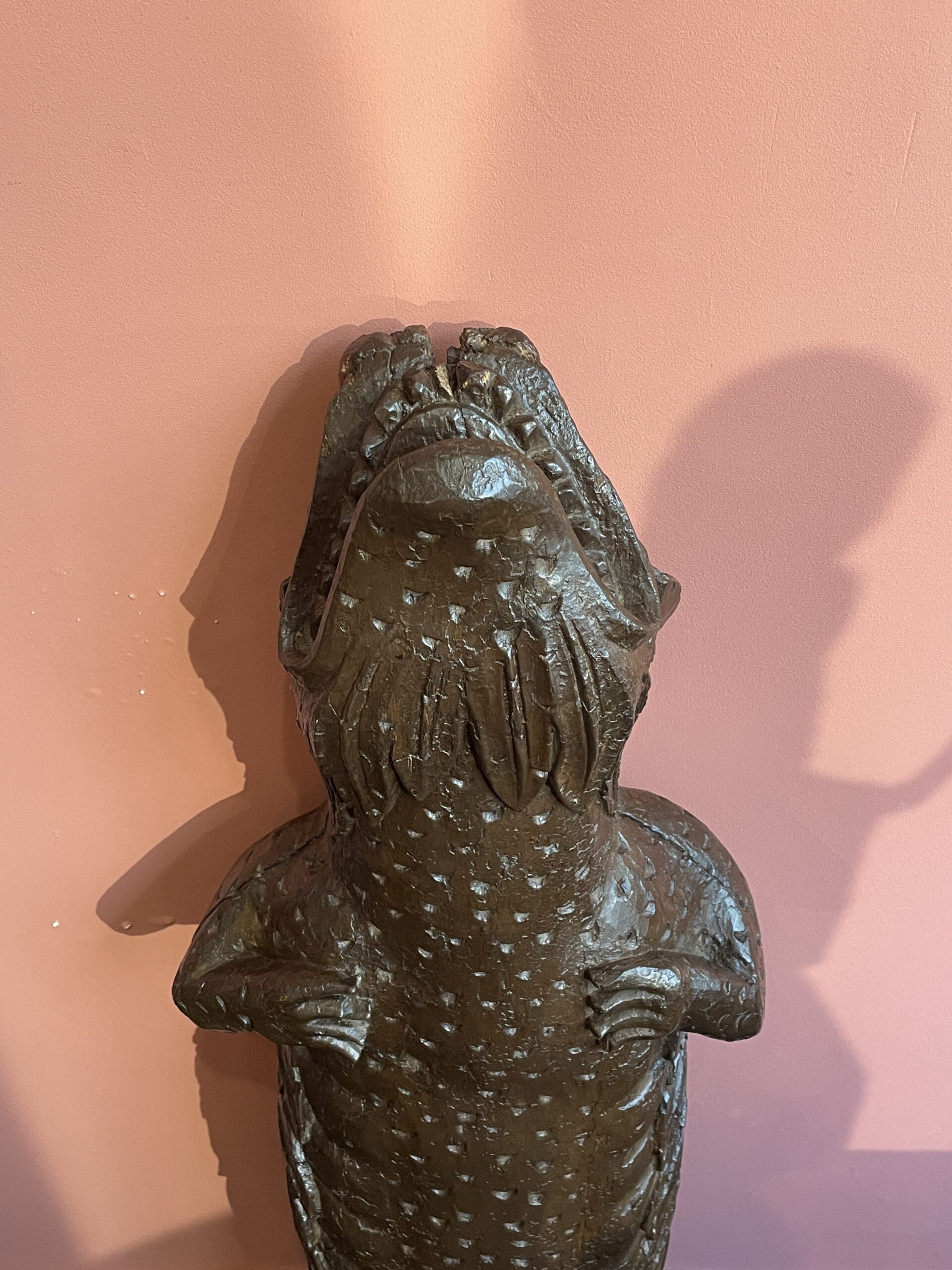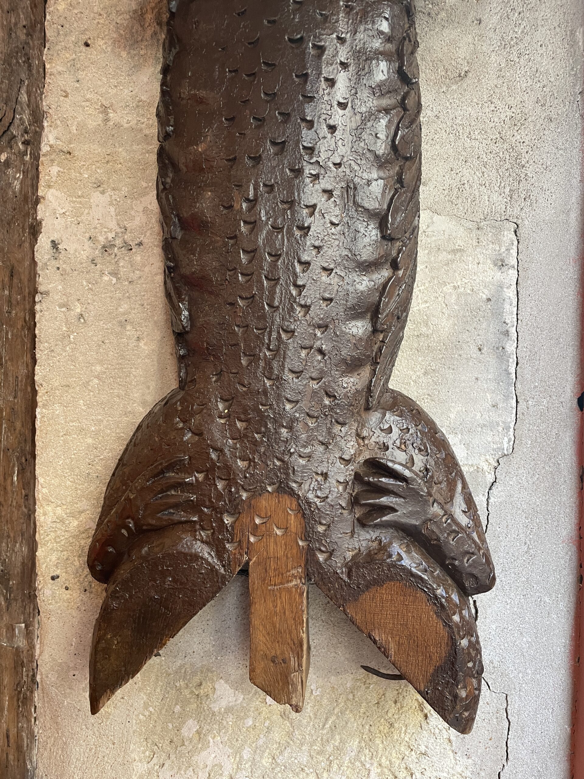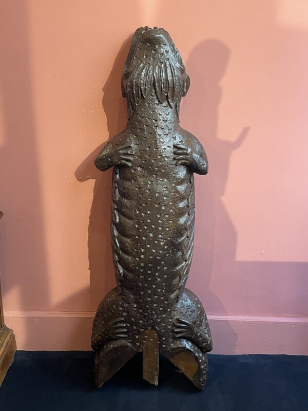 Cet élément en bois massif de chêne était probablement placé à l’extérieur, au niveau des charpentes apparentes d’une maison normande. Figurée de face, elle est traitée de manière stylisée. Les écailles se dessinent sur tout son corps tandis que ressortent les franges de son col. Elle descendait du colombage, tête vers le bas.