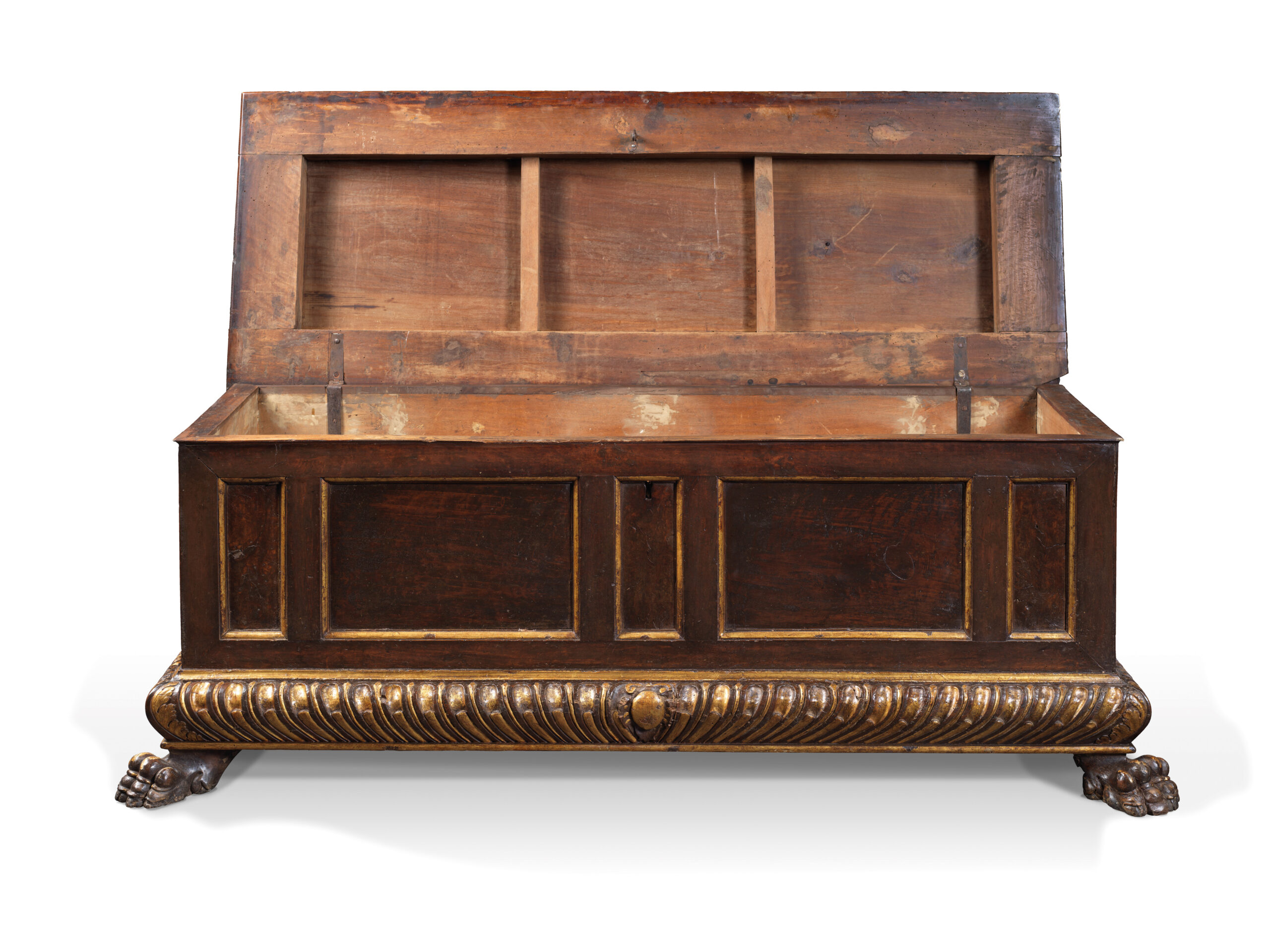 Grand coffre de mariage en noyer teinté et doré, le couvercle à doucine animé d’une frise de perles, les côtés compartimentés, la ceinture à décor de godrons. Il repose sur quatre pieds griffes.