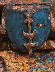 L’encadrement de ce grand panneau est mouluré et sculpté de feuillages découpés. Il porte en son centre un écu. Il s’agit de la conjonction des armoiries de rois mages. En effet, les Rois Mages reçurent, comme d’autres personnages historiques et légendaires, des armoiries imaginaires. On retrouve ainsi sur fond d’azur: une étoile pour Melchior, un croissant pour Gaspard et un pennon pour Balthazar.