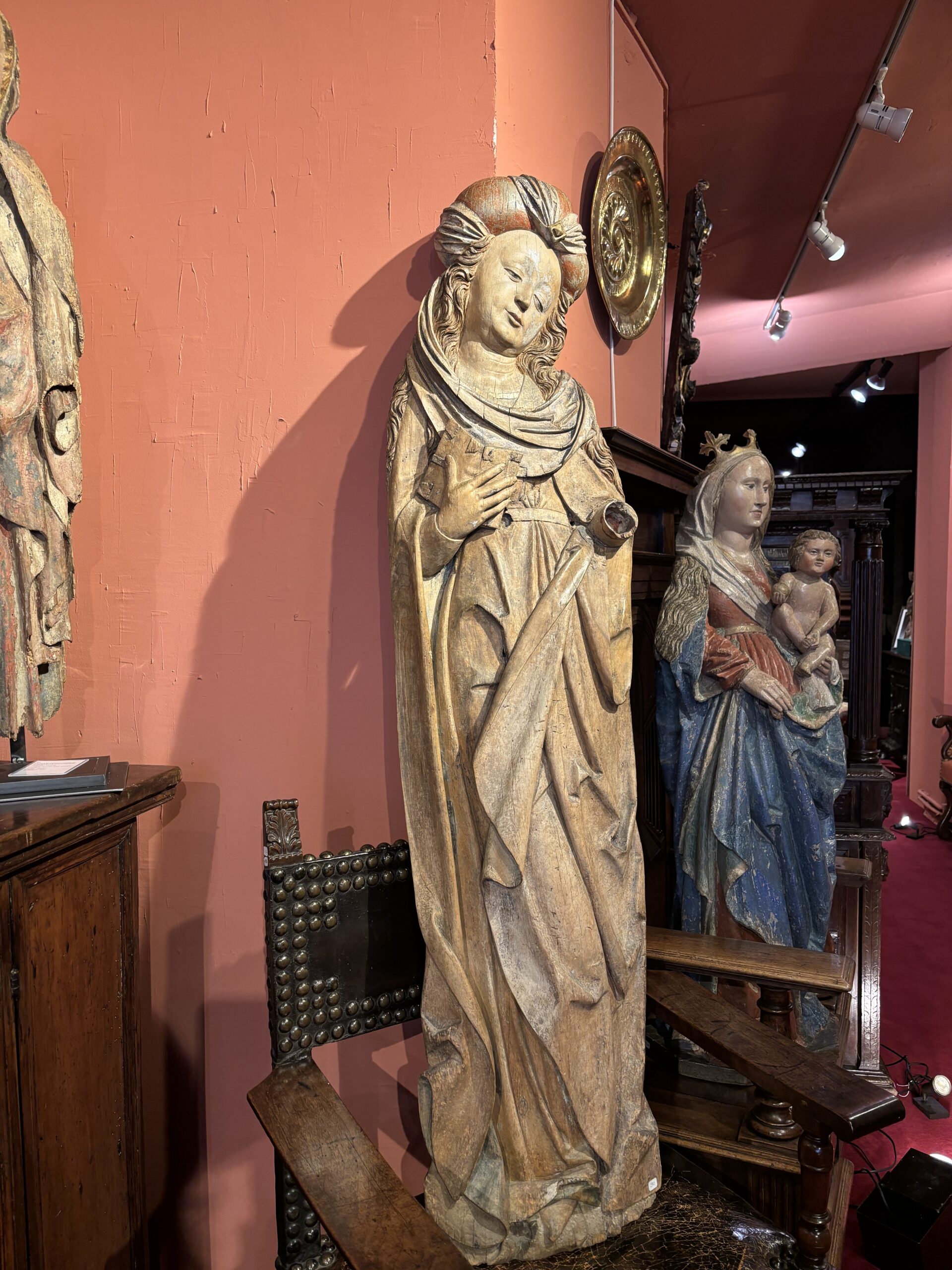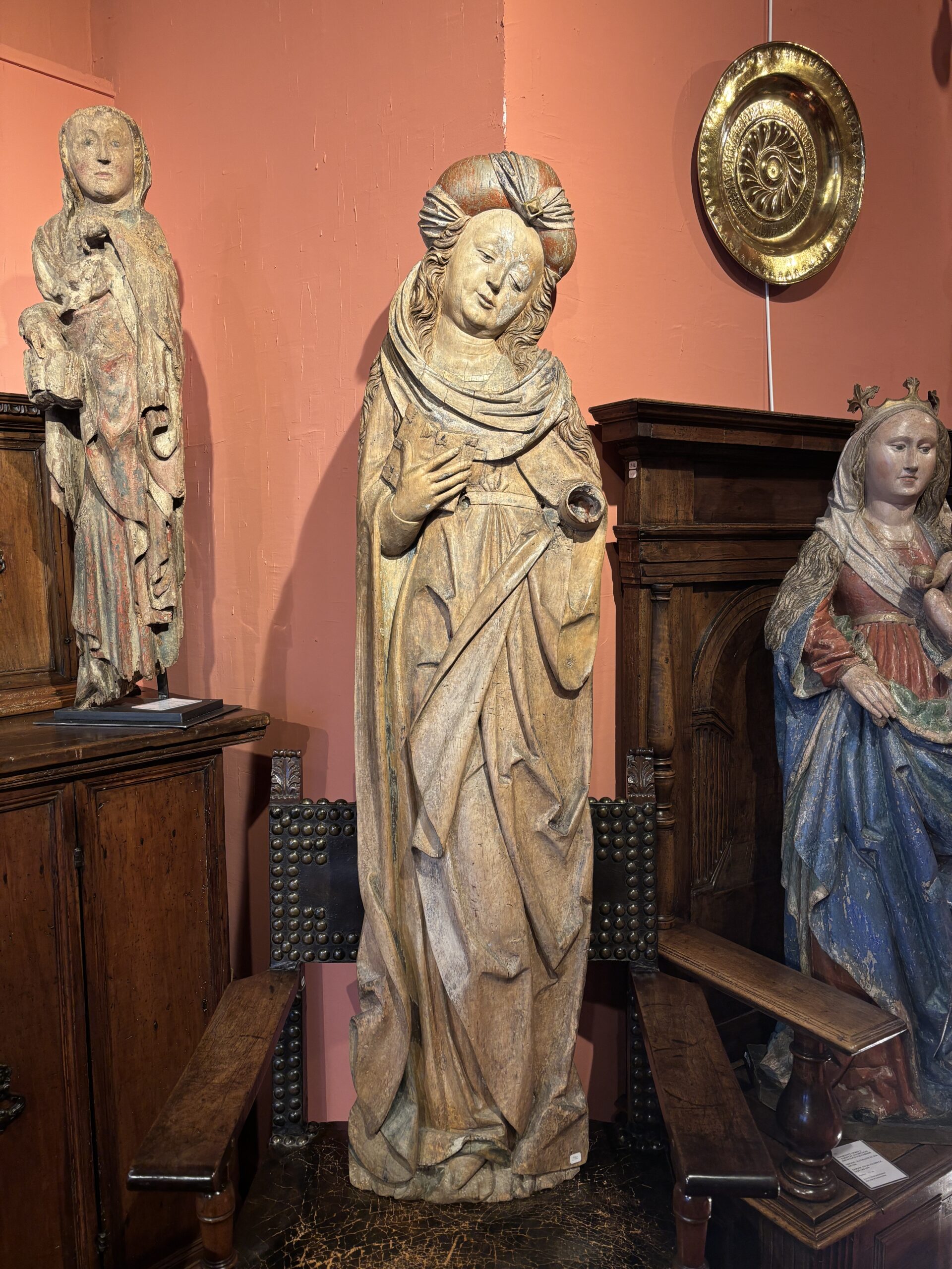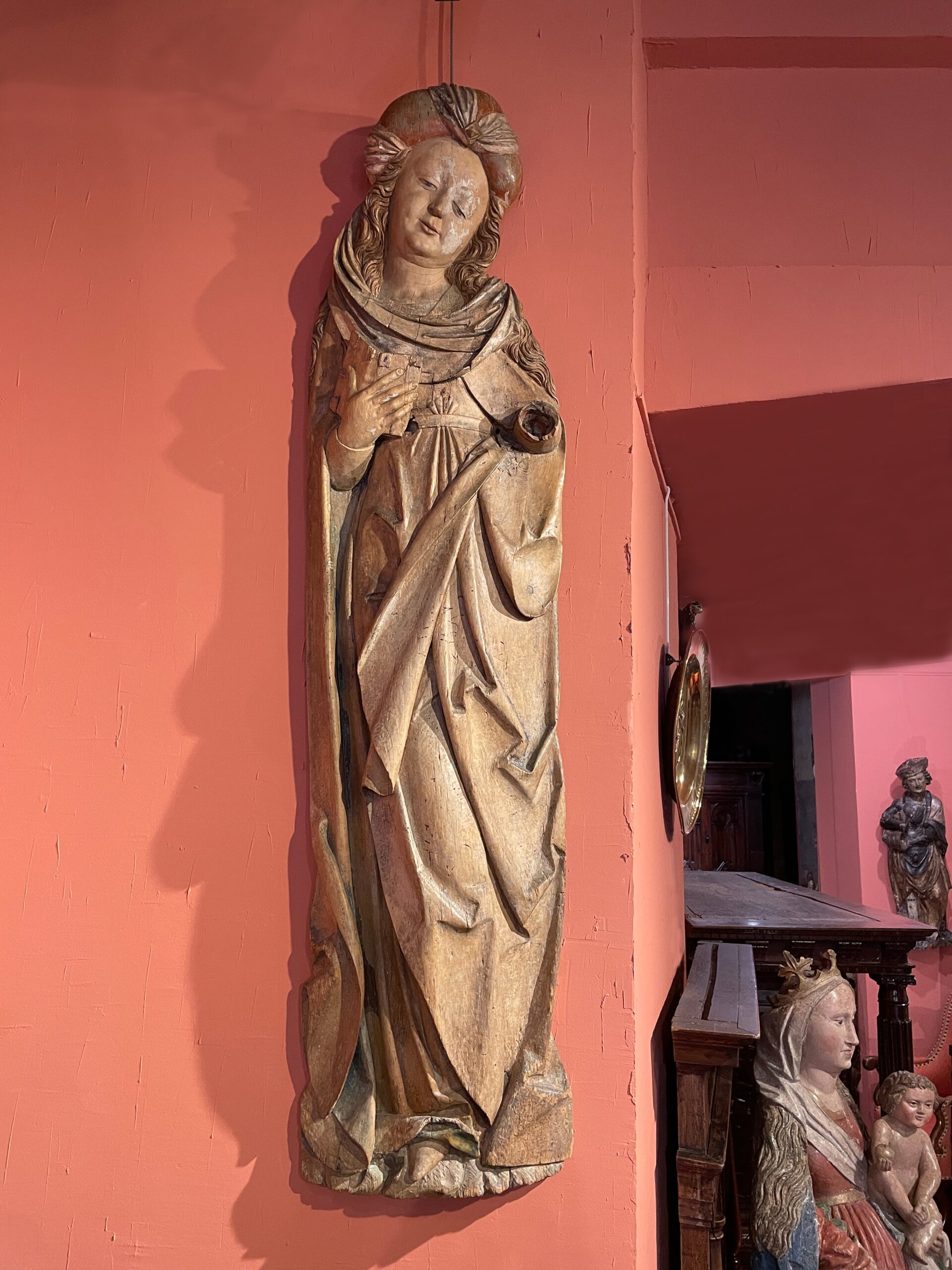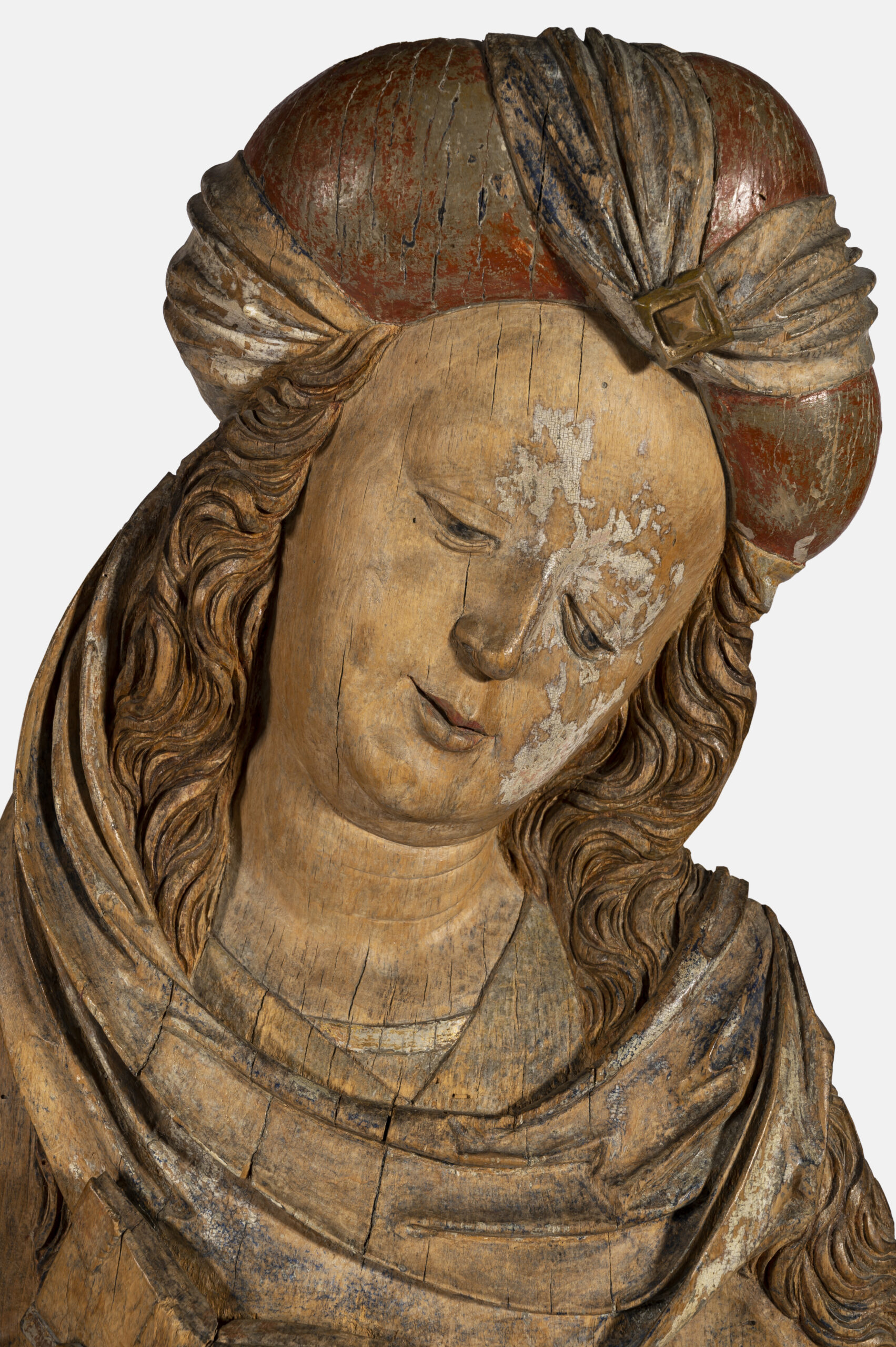 La sculpture présente ici s’inscrit parfaitement dans ce mouvement du spätgotik. Elle est réalisée dans un bois de tilleul de belle qualité. Le bois de tilleul est particulièrement en faveur auprès des sculptures de tout le sud de l’Allemagne, dès le milieu du XVe siècle. Ce bois léger et homogène permet une taille précise, un rendu fin et un très beau poli.