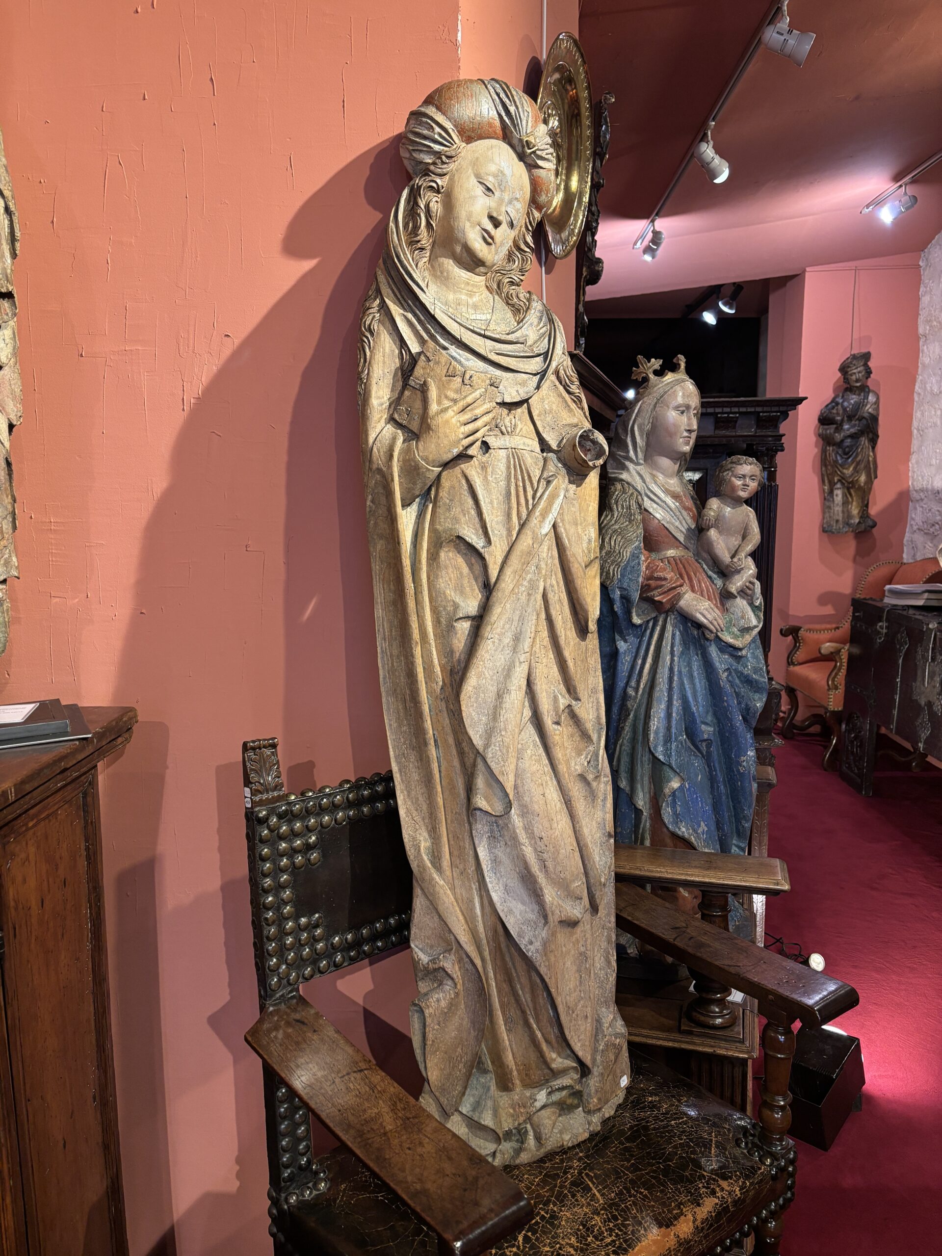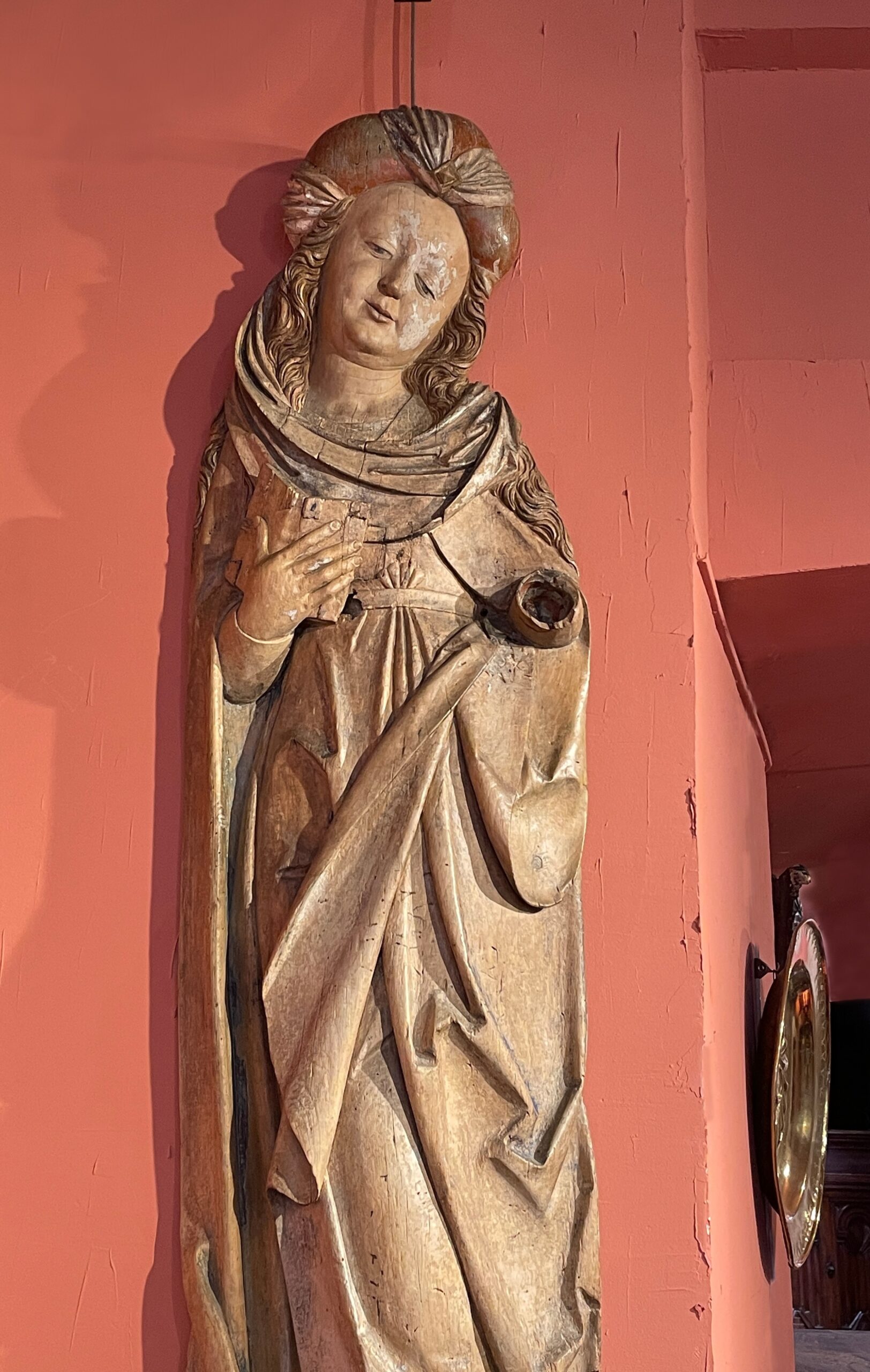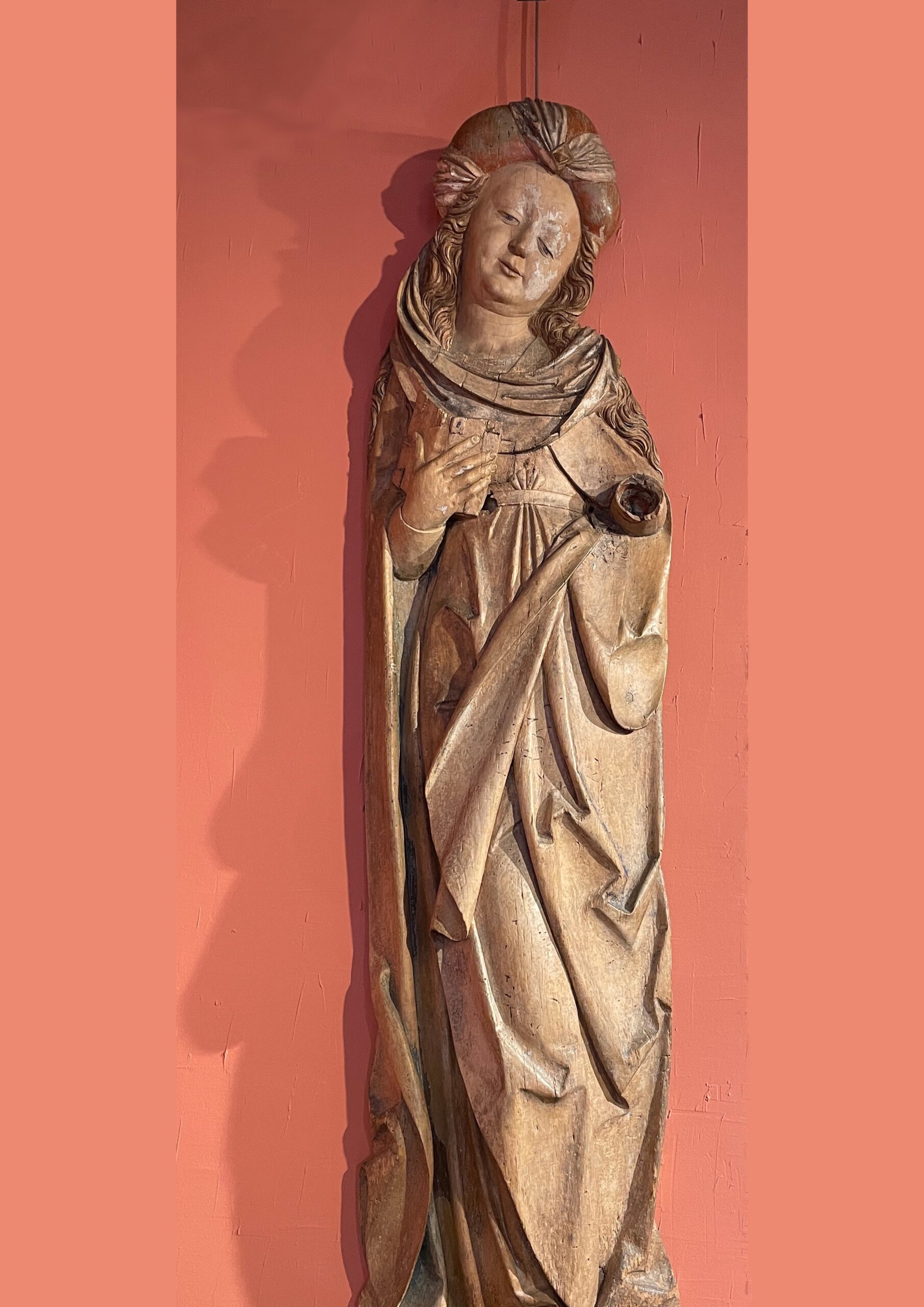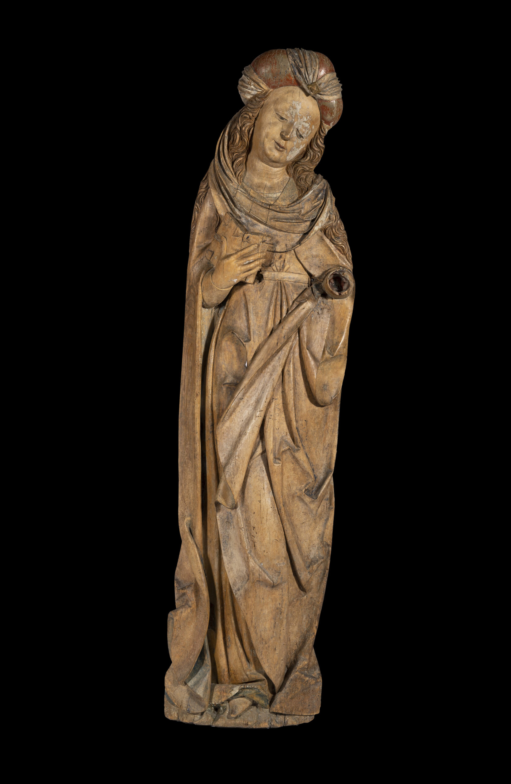 Comme le suggère le vide laissé par la main gauche, celle-ci était rapportée à la sculpture et non sculptée dans la masse. Cela est typique des oeuvres de cette époque. Malheureusement son absence nous empêche de proposer une identification certaine pour cette Sainte femme. Néanmoins, le « turban » qui coiffe sa tête, couramment employé dans la sculpture souabe du XVe siècle indique, à l’instar d’une couronne, une noble naissance.