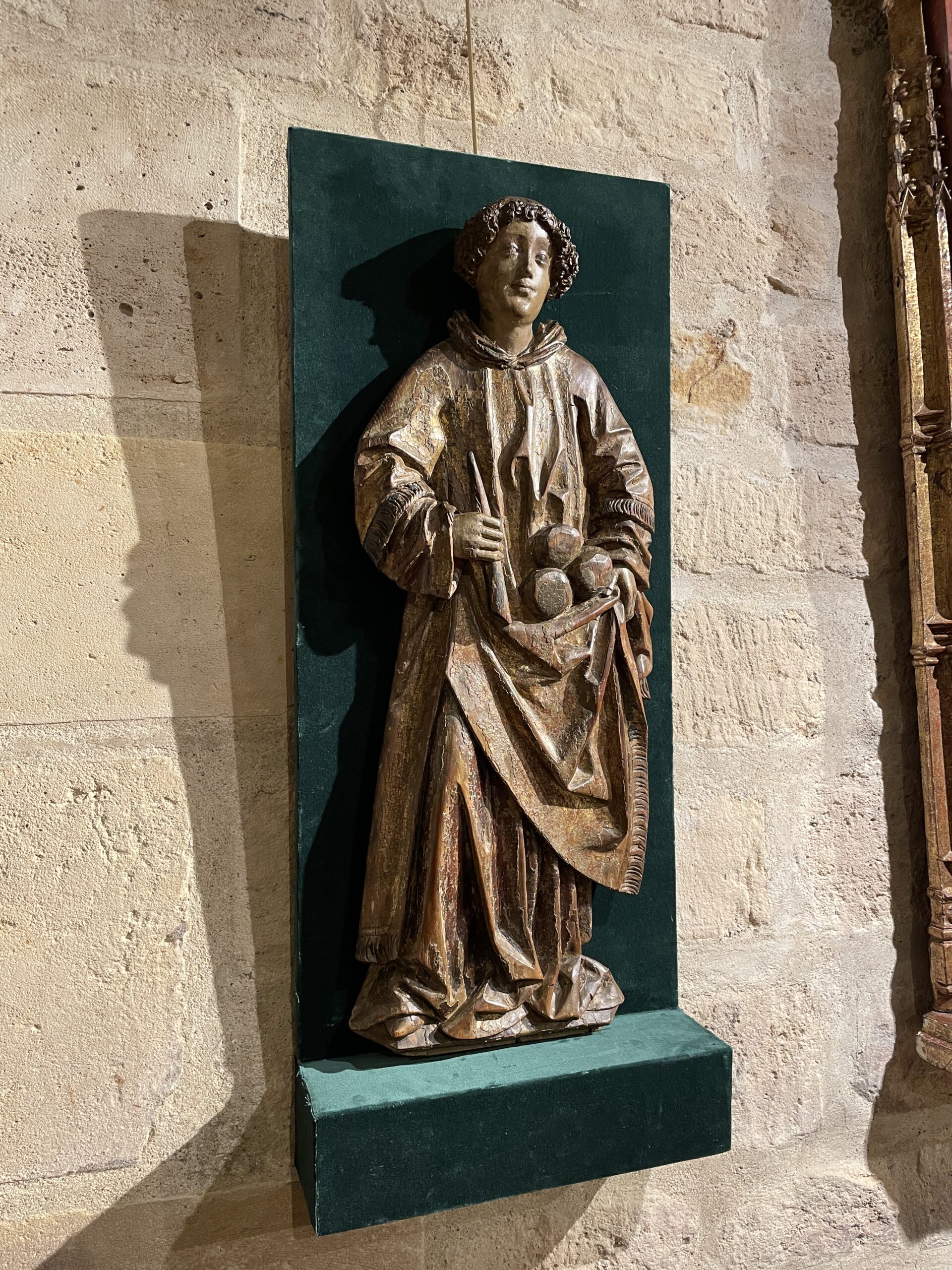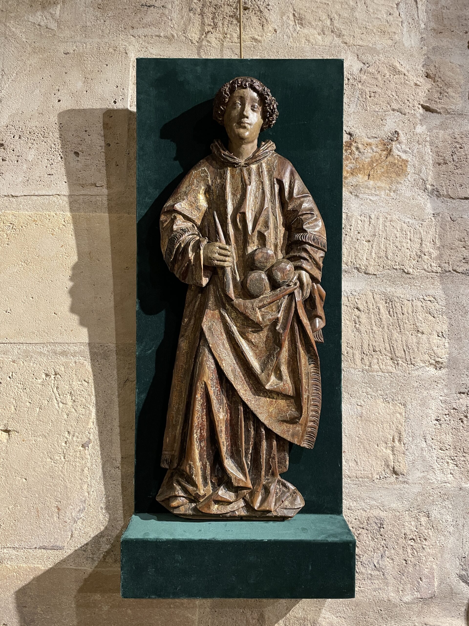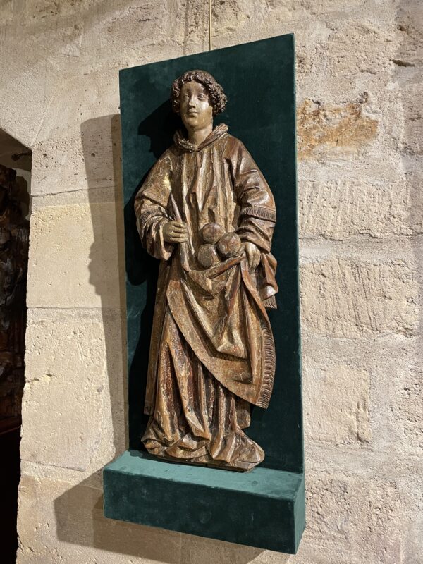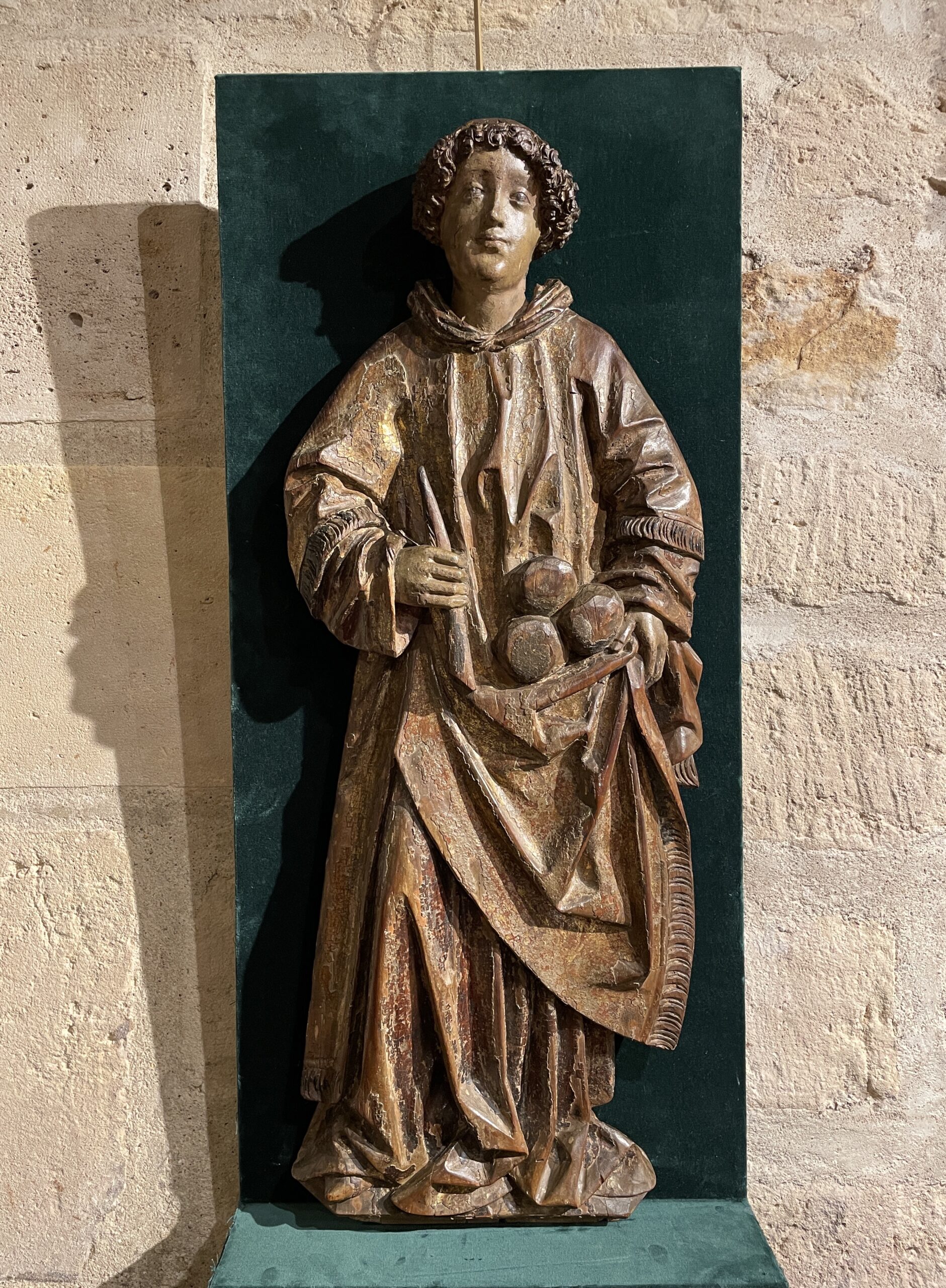 Saint Etienne porte une tunique couverte d’une dalmatique au tissu épais. Le traitement des plis du drapé lui confère une grande matérialité et beaucoup de réalisme. Cette tenue rappelle son statut de diacre.