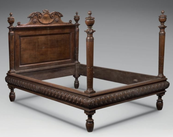Pièce majeure du mobilier, le lit est au centre des grands évènements de la vie, scène régie par l’étiquette et les règles de bienséance. Il occupe aussi une place déterminée dans la chambre d’apparat par rapport à la cheminée, différente selon la mode italienne (angle opposé) ou l’usage français (à côté). Le rôle des étoffes reste déterminant, et le dais suspendu d’usage courant pendant tout le seizième siècle. Les quenouilles ne montent alors, comme ici, qu’à une certaine hauteur pour y accrocher les rideaux du ciel. Aux quatre angles, les quenouilles prennent l’aspect du fuseaux annelés, à la base enrobée de feuillages, au sommet épanoui en toupie. Elles reposent sur un cadre monté sur quatre pieds, tournés en vase à haut col. Sur le chevet plein s’élève un fronton curviligne échancré, frappé en son centre d’une coquille.