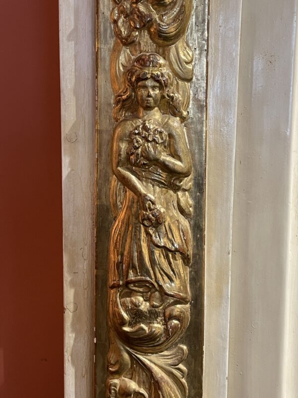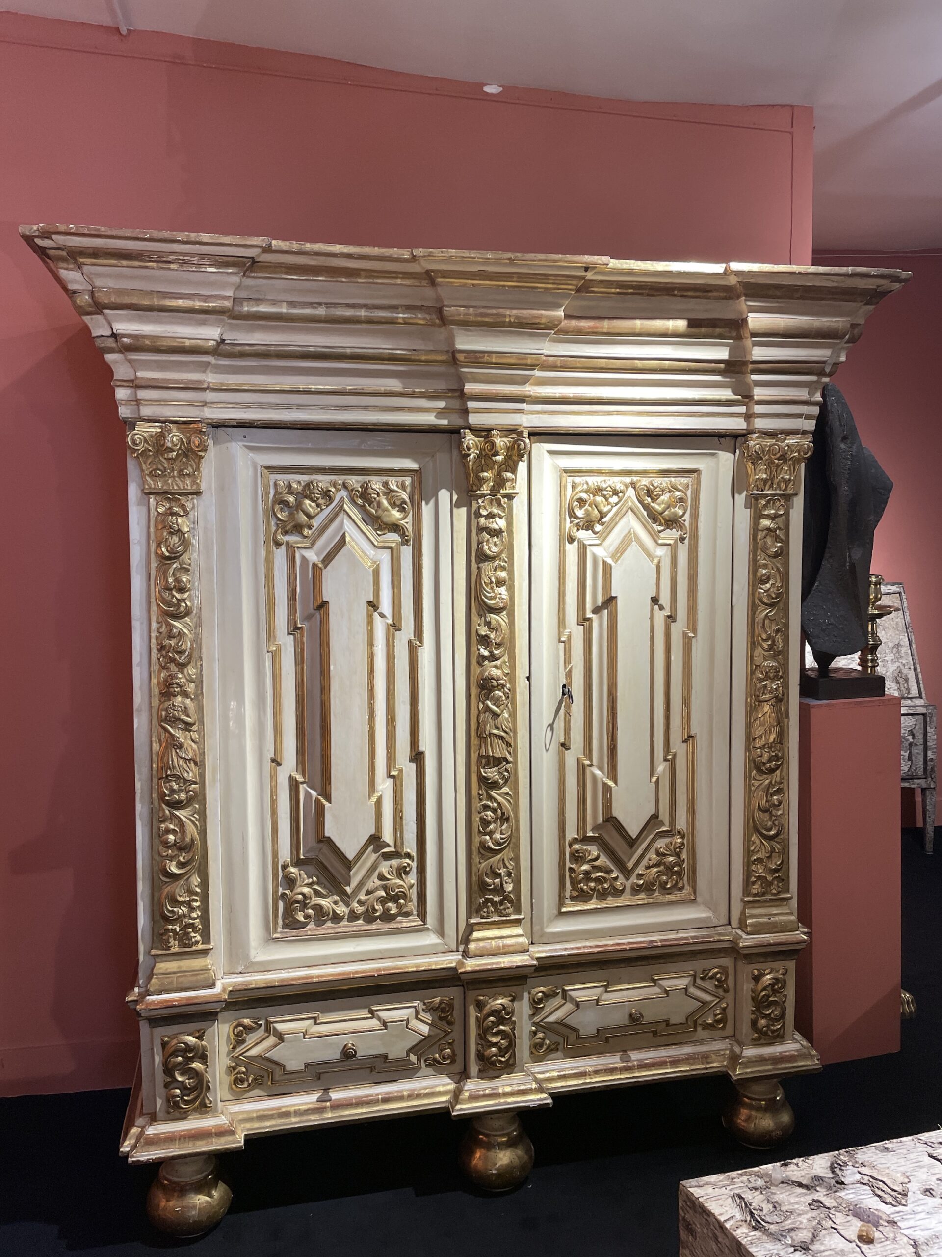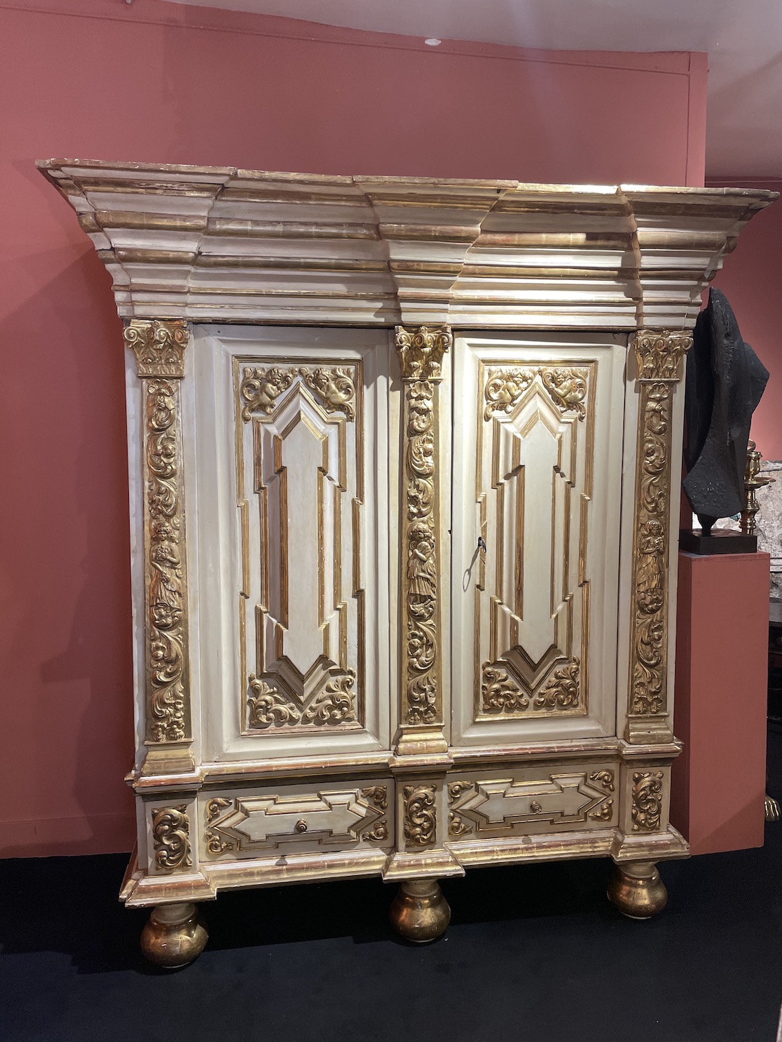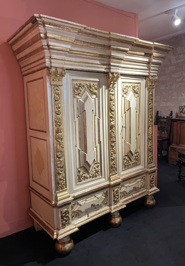 Cette imposante armoire est scandée de trois pilastres corinthiens, sculptés de feuillages et de fleurs encadrant un personnage féminin central et repose sur trois pieds boule.