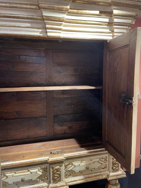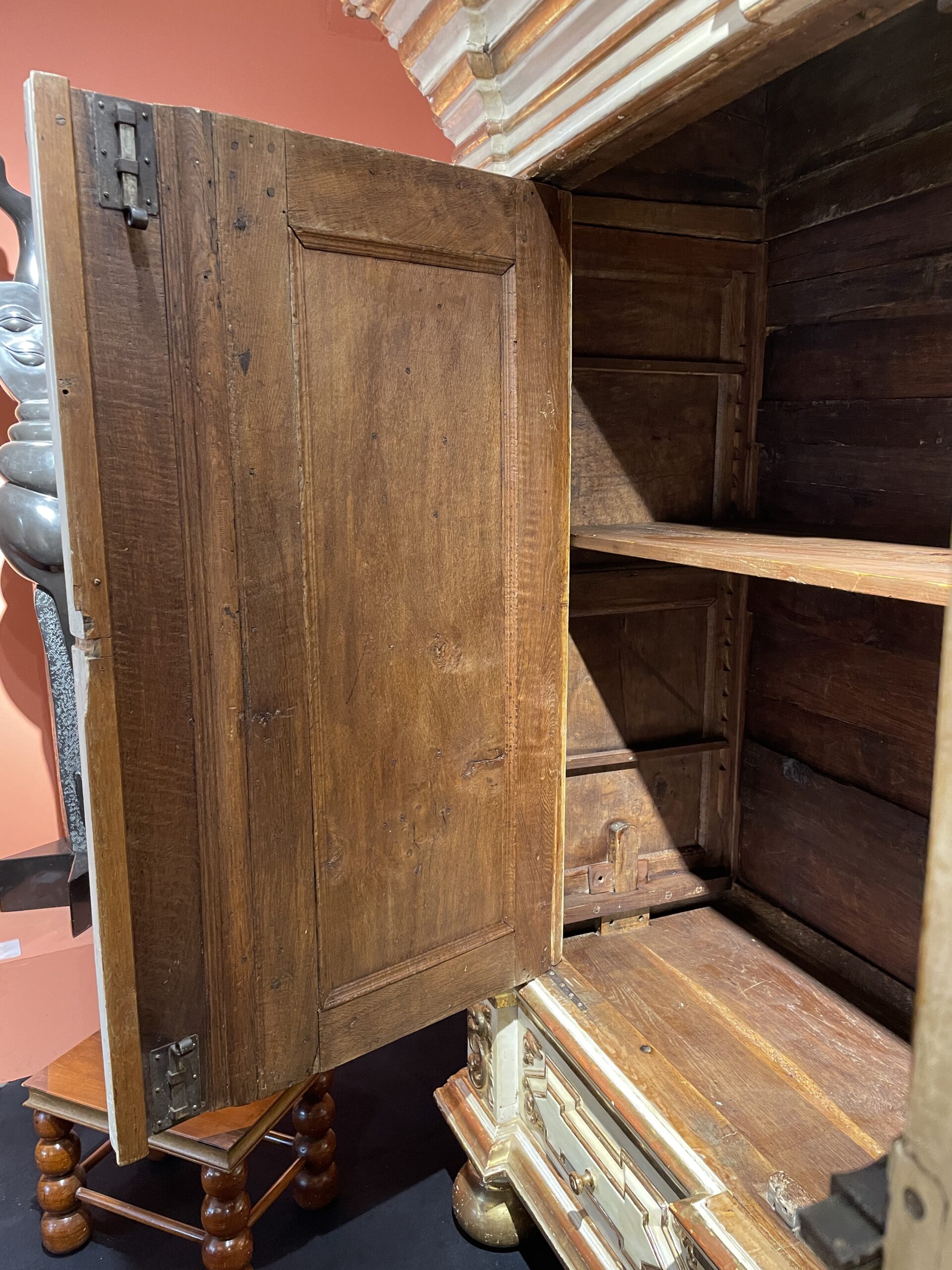 Au début du XVIIe siècle c’est le chêne qui a la faveur des ébénistes, le noyer remplace peu à peu, alternant avec l’ébène. Ici on peut admirer à l’intérieur, la finesse des fonçures travaillées sur un chêne provenant de Hongrie.