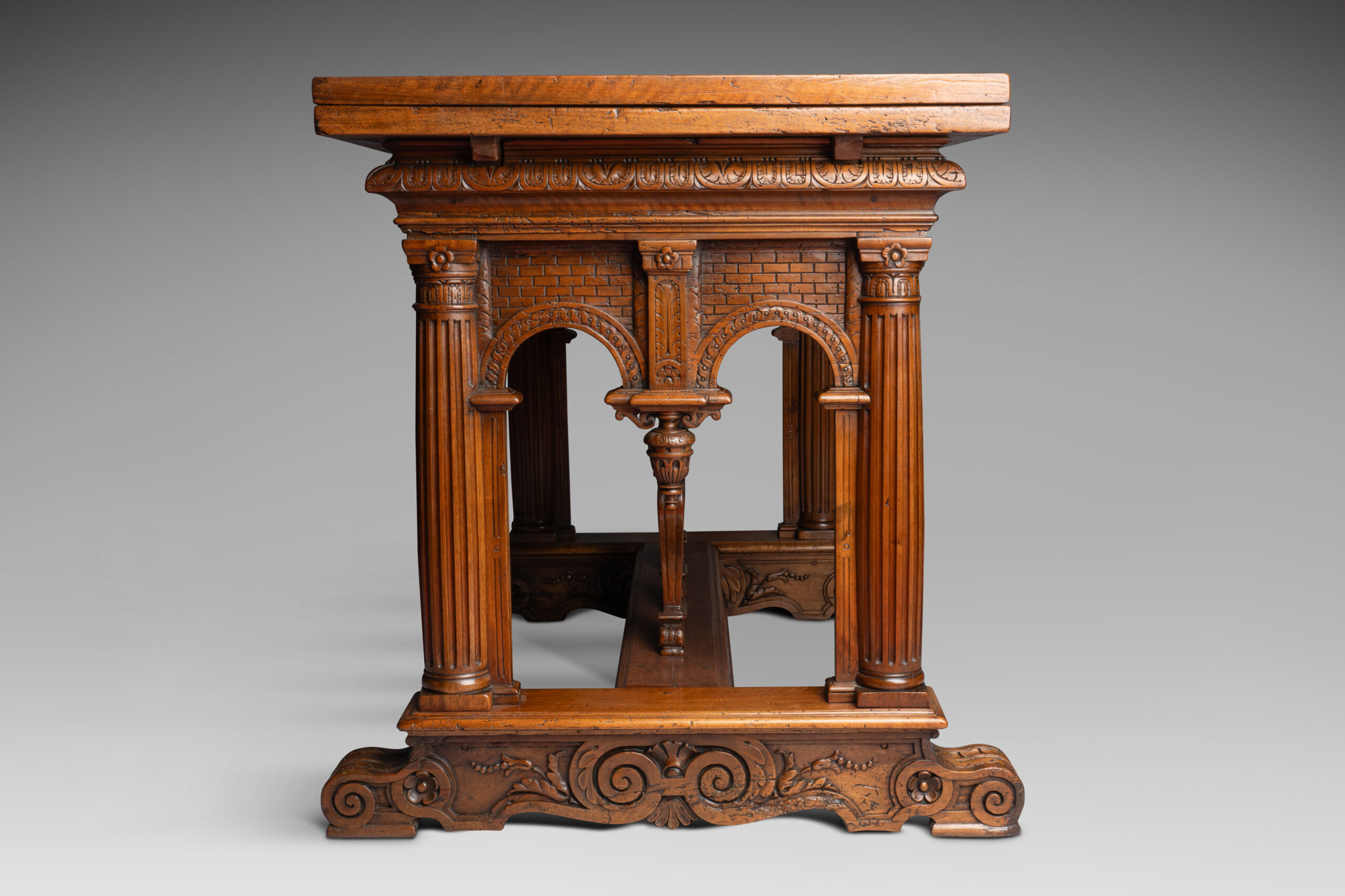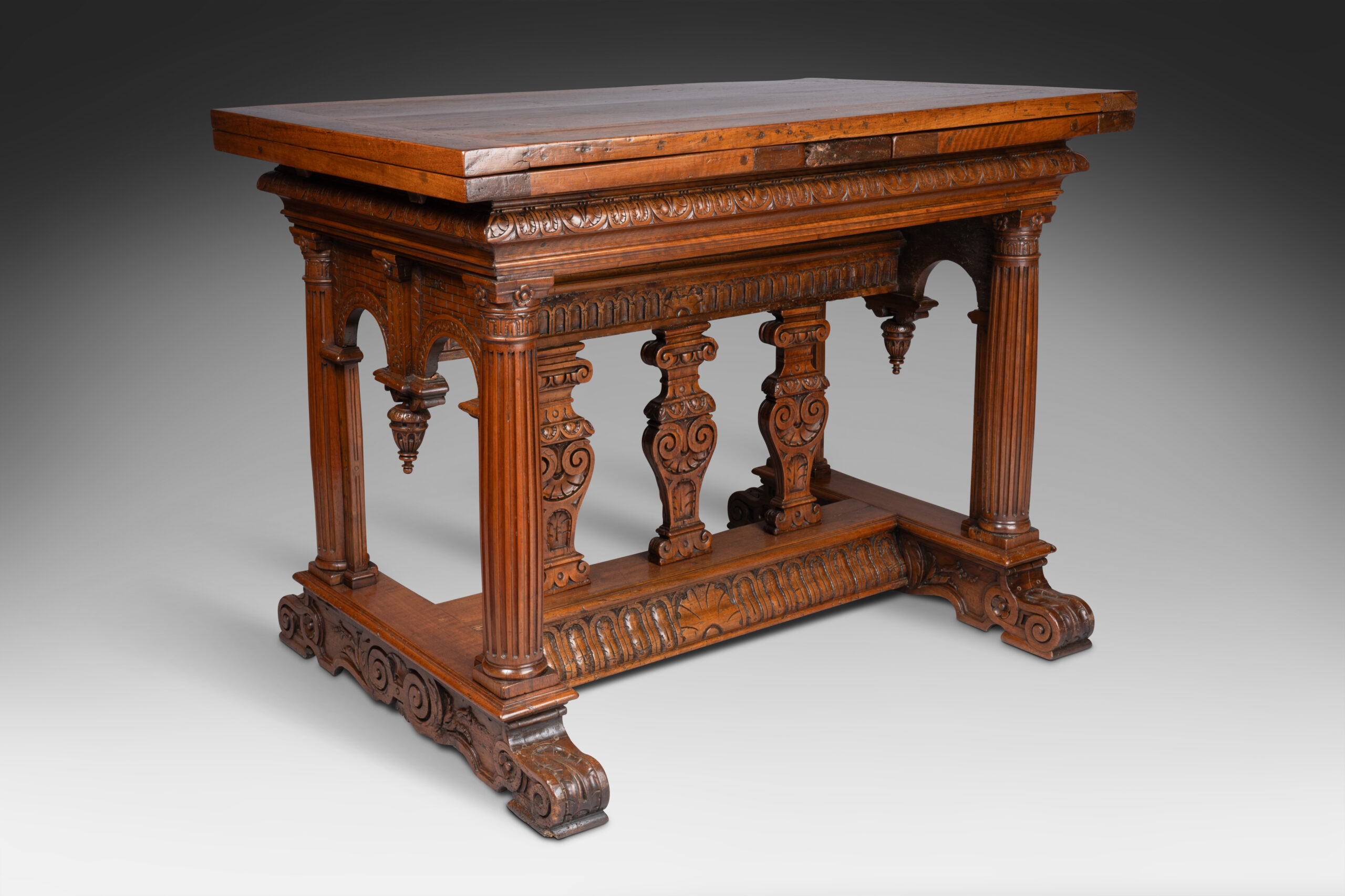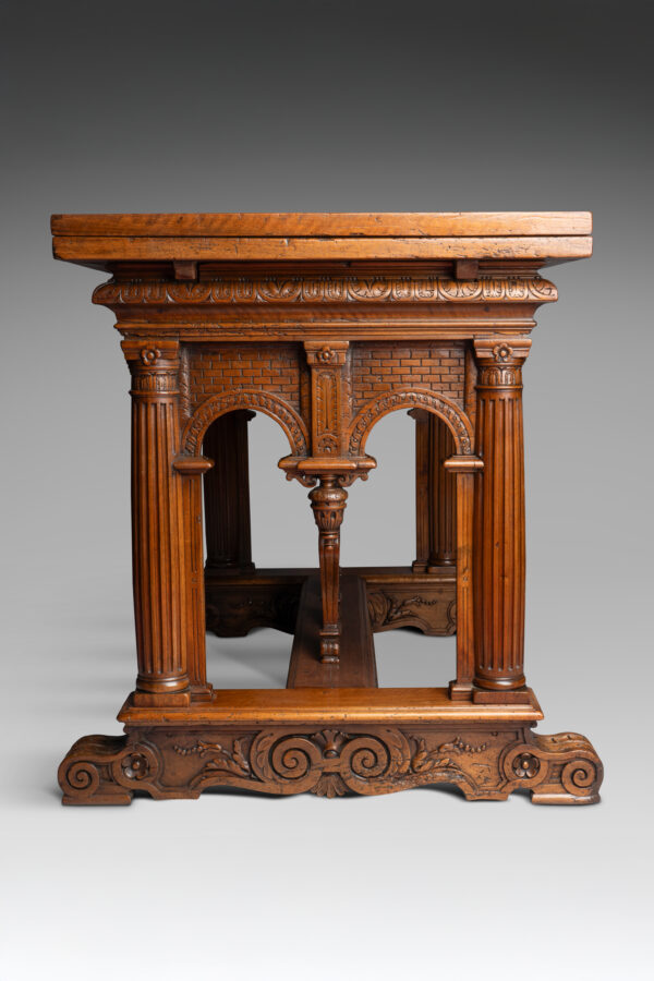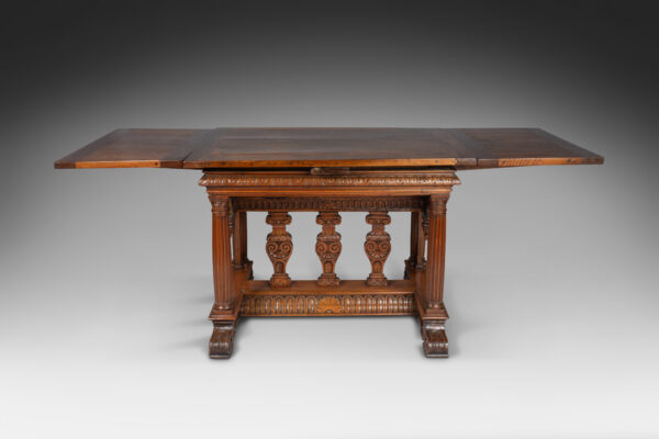 Cette table à l’extraordinaire finesse d’exécution, est dans un état de conservation remarquable ; en effet peu de tables de cette époque ont gardé entièrement leur intégrité. On rencontre ces tables à allonges dans les inventaires, à partir de 1560.