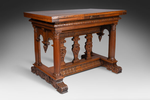 La table française se métamorphose pendant la Renaissance. Inspirée de l’Italie dans sa forme et ses décors, elle naît dans le creuset de l’École de Fontainebleau, où se forment des architectes et ornemanistes, tels Jacques Androuet du Cerceau et Hugues Sambin. A la fois table d’apparat et « morceau de sculpture », elle marque « un des sommets du meuble en France. » Jacque Thirion.