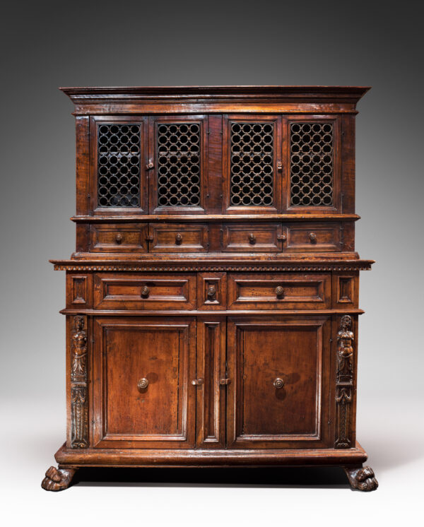 Au-dessus le meuble ouvre à nouveau à deux double vantaux, munis de grilles formées d’anneaux en fer forgé d’origine.