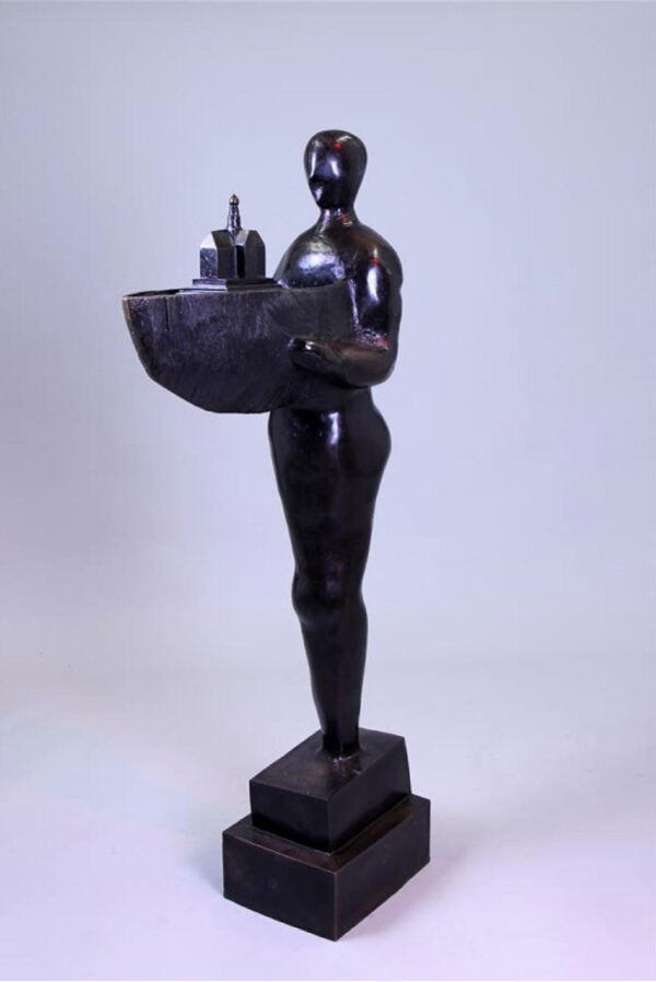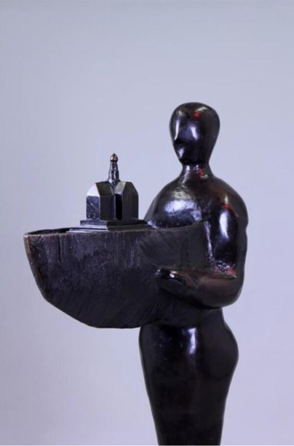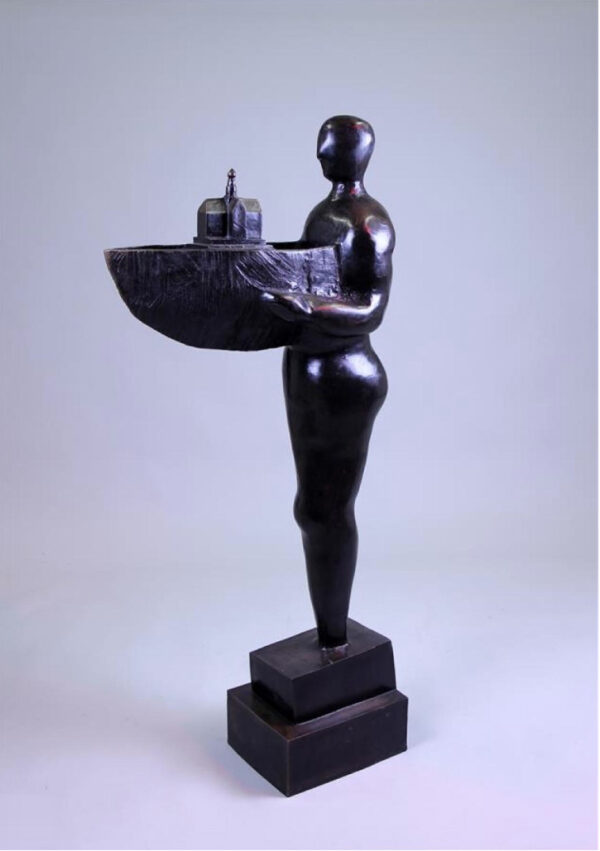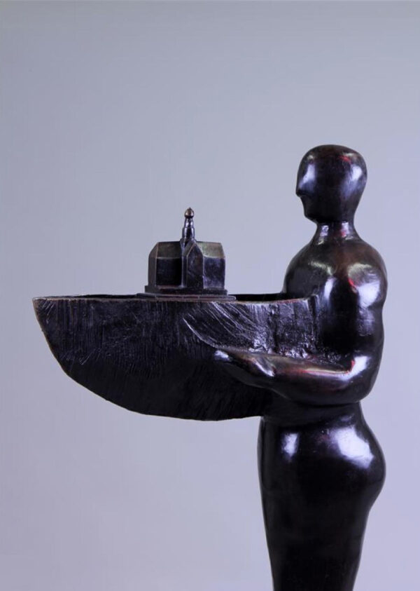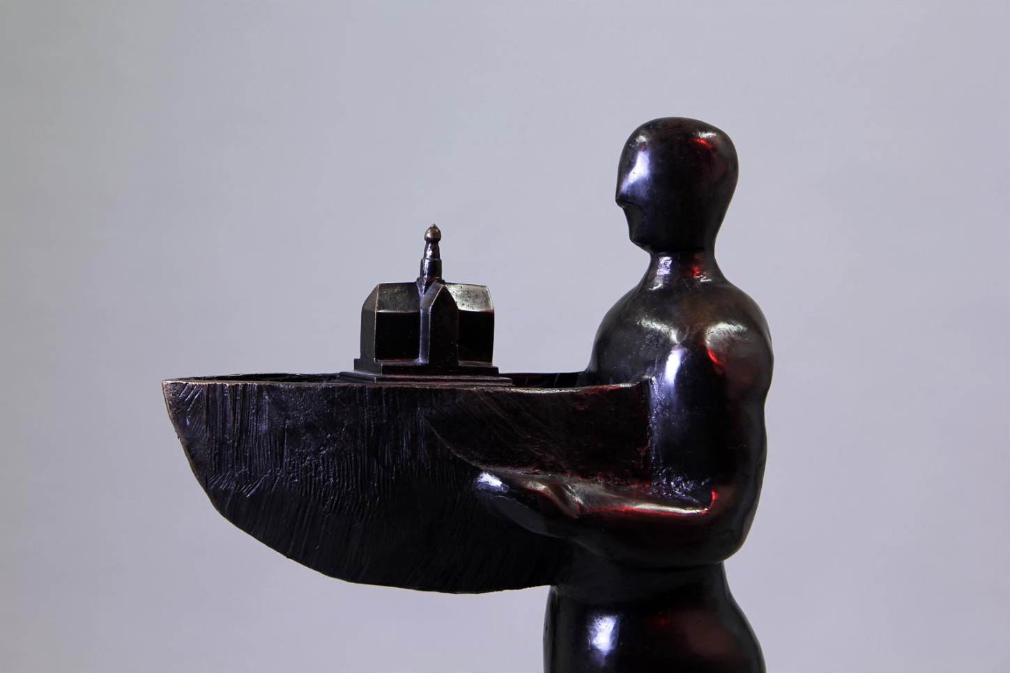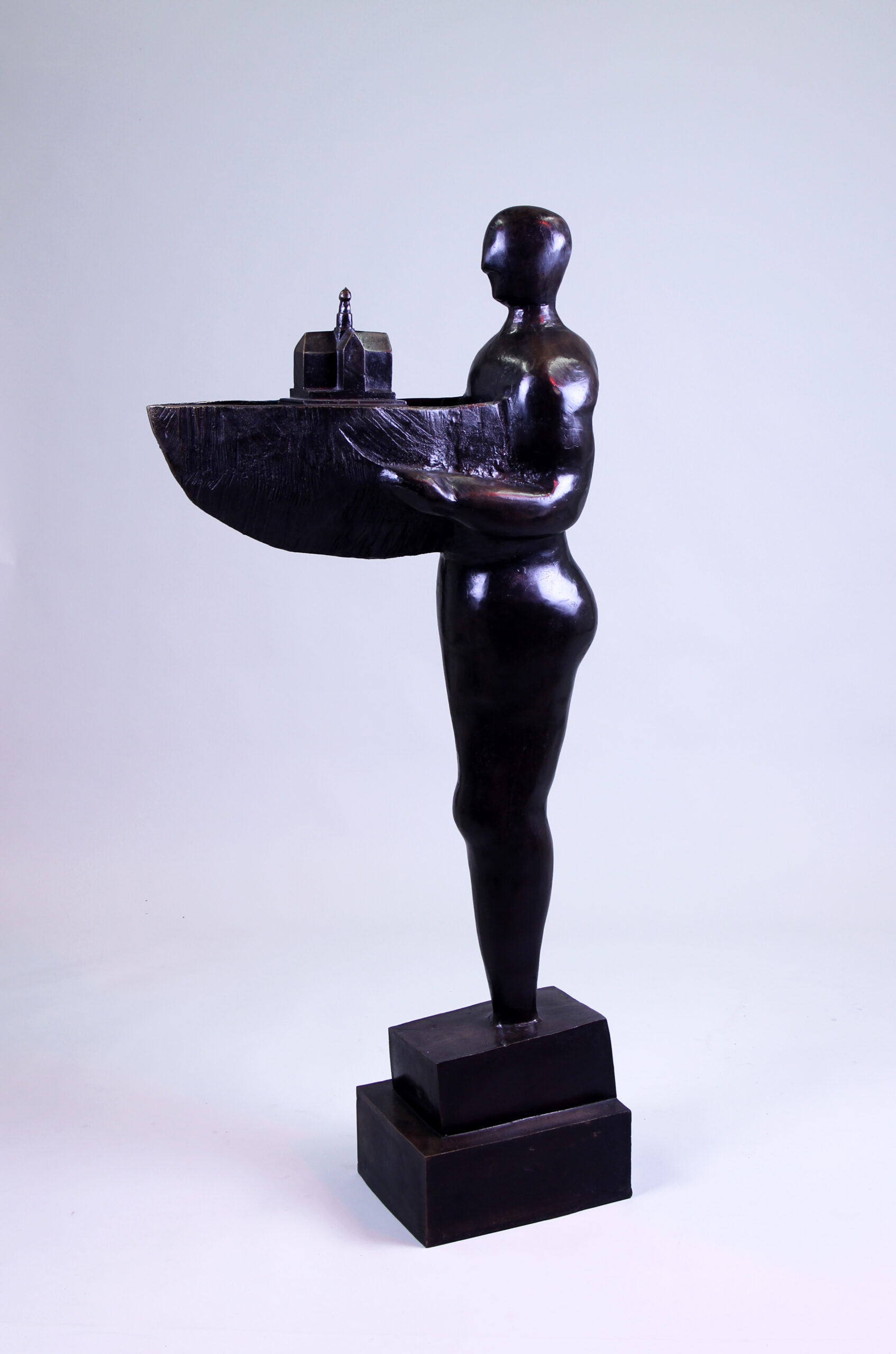 Groupe en bronze patiné représentant un personnage tenant la proue d’un navire sur laquelle repose une église.