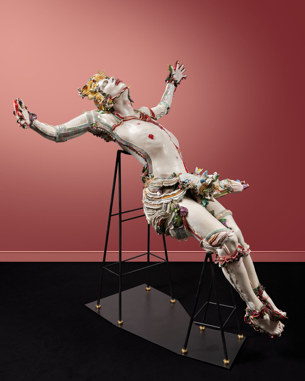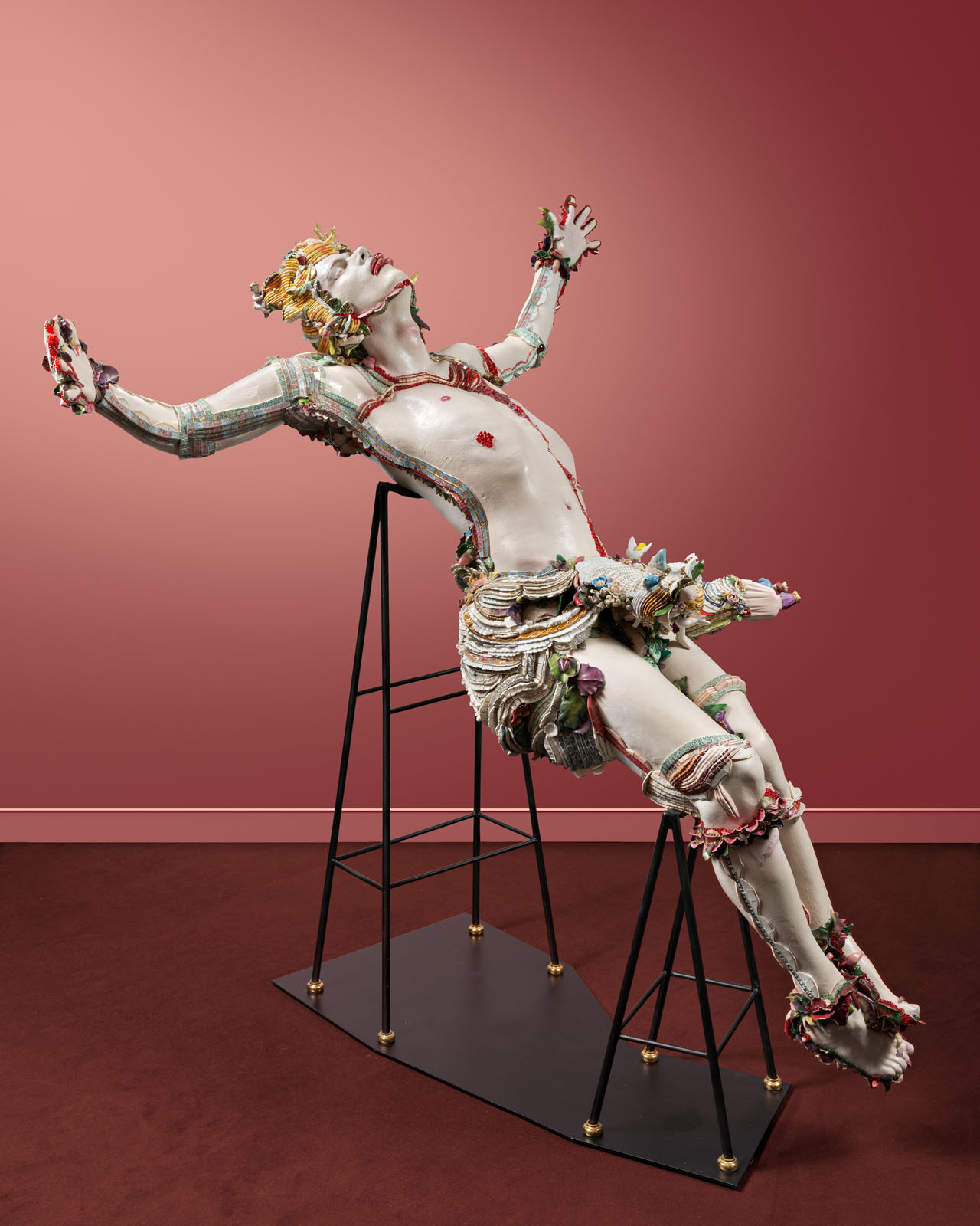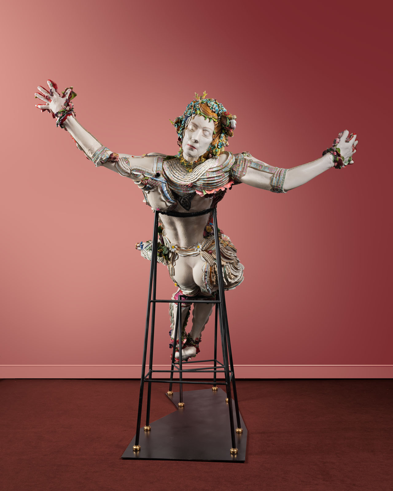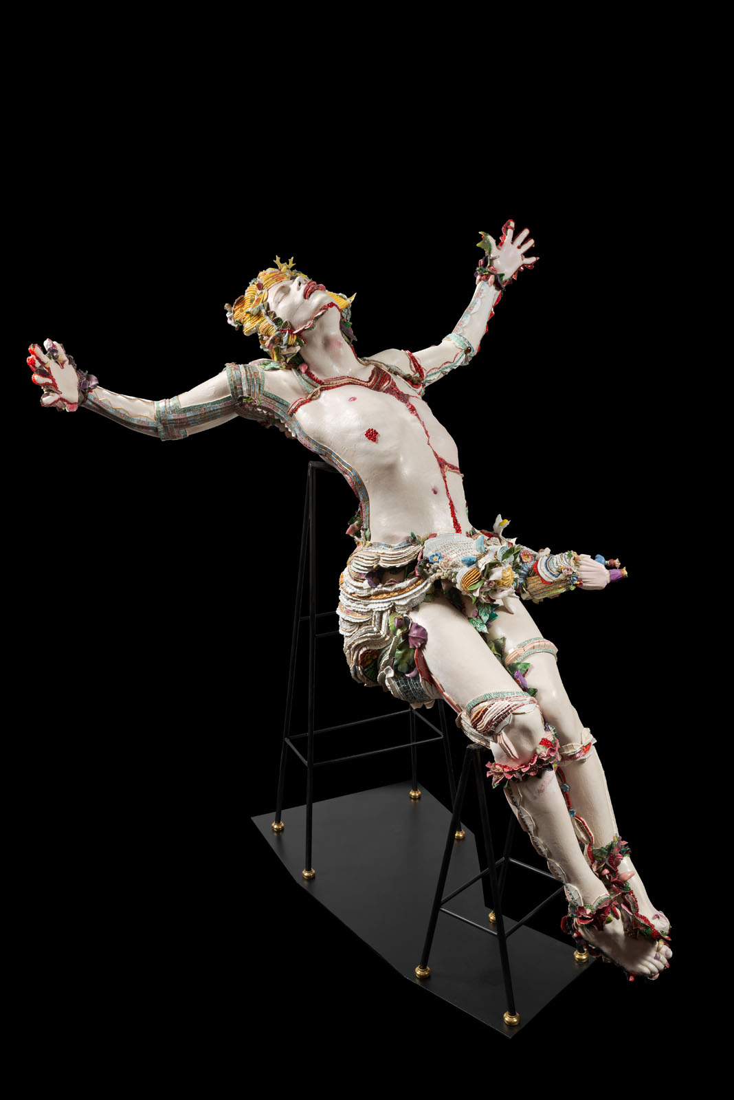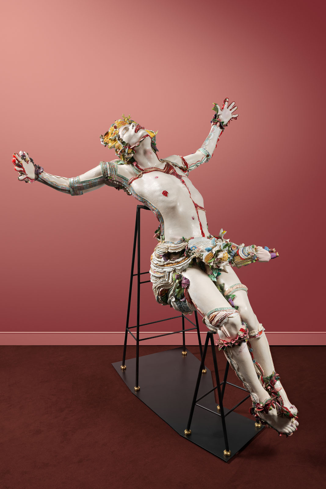 Les drapés ainsi que les chevelures sont composés de bords d’assiettes découpés. Certains reconstituent la frise initiale de l’assiette.