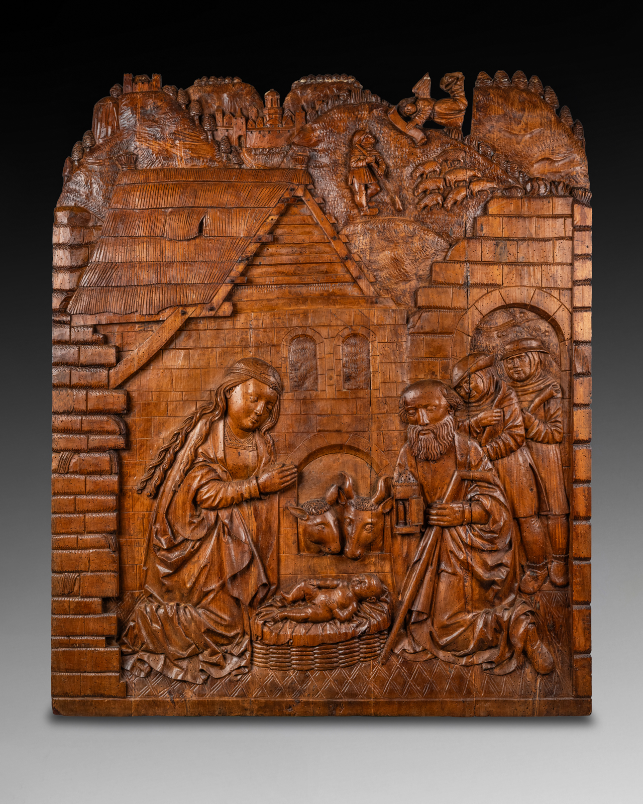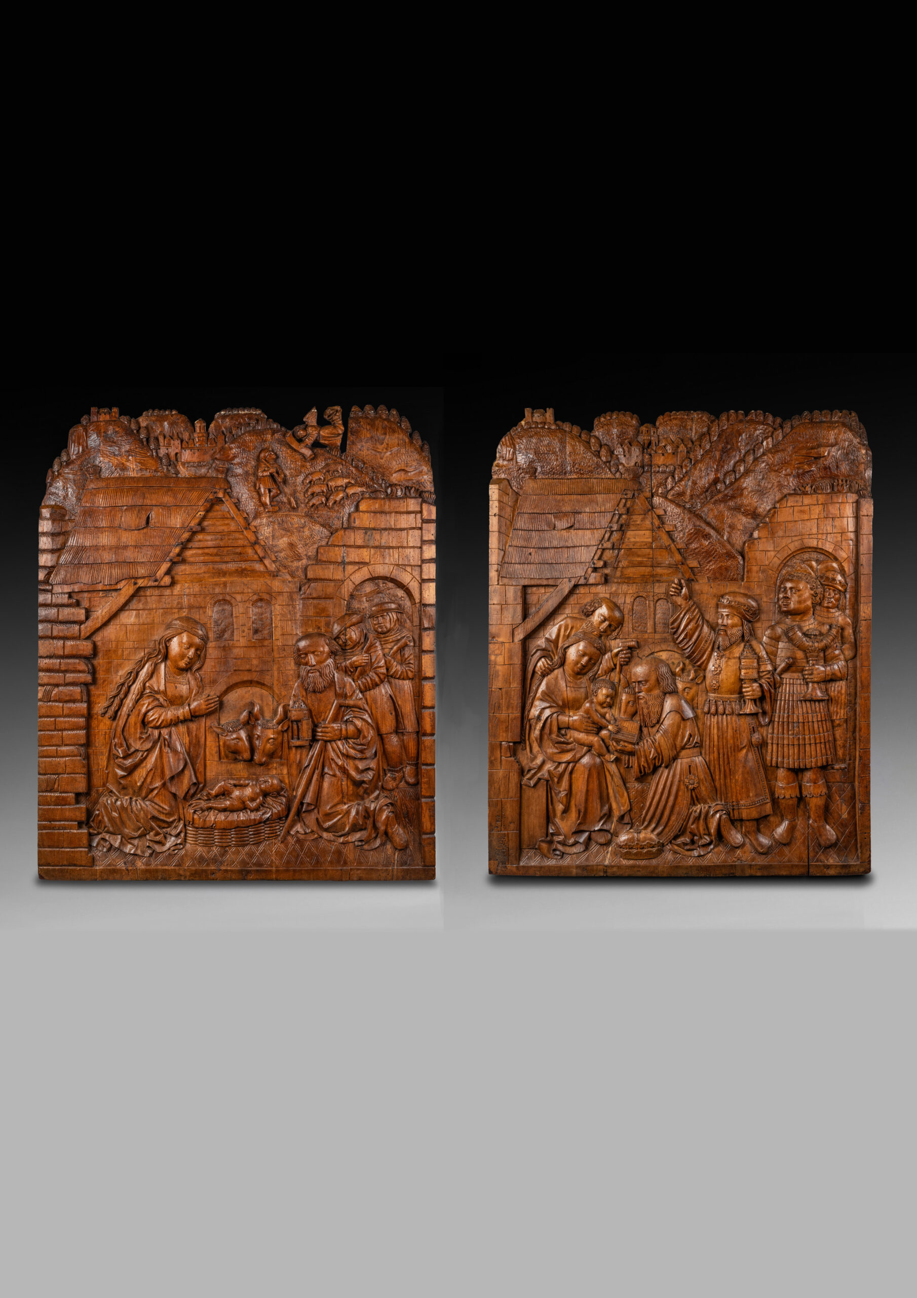Les deux bois d’applique en faible relief retracent les différentes étapes du récit de la Naissance de Jésus.