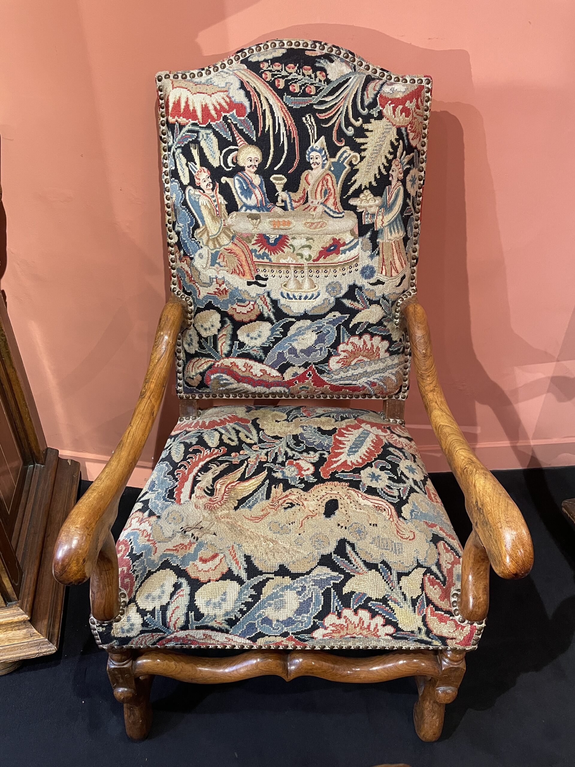 Le second fauteuil au décor toujours aussi luxuriant, présente une scène de repas où trois personnages festoient gaiement tandis qu’un serviteur apporte un beau plateau de fruits.
