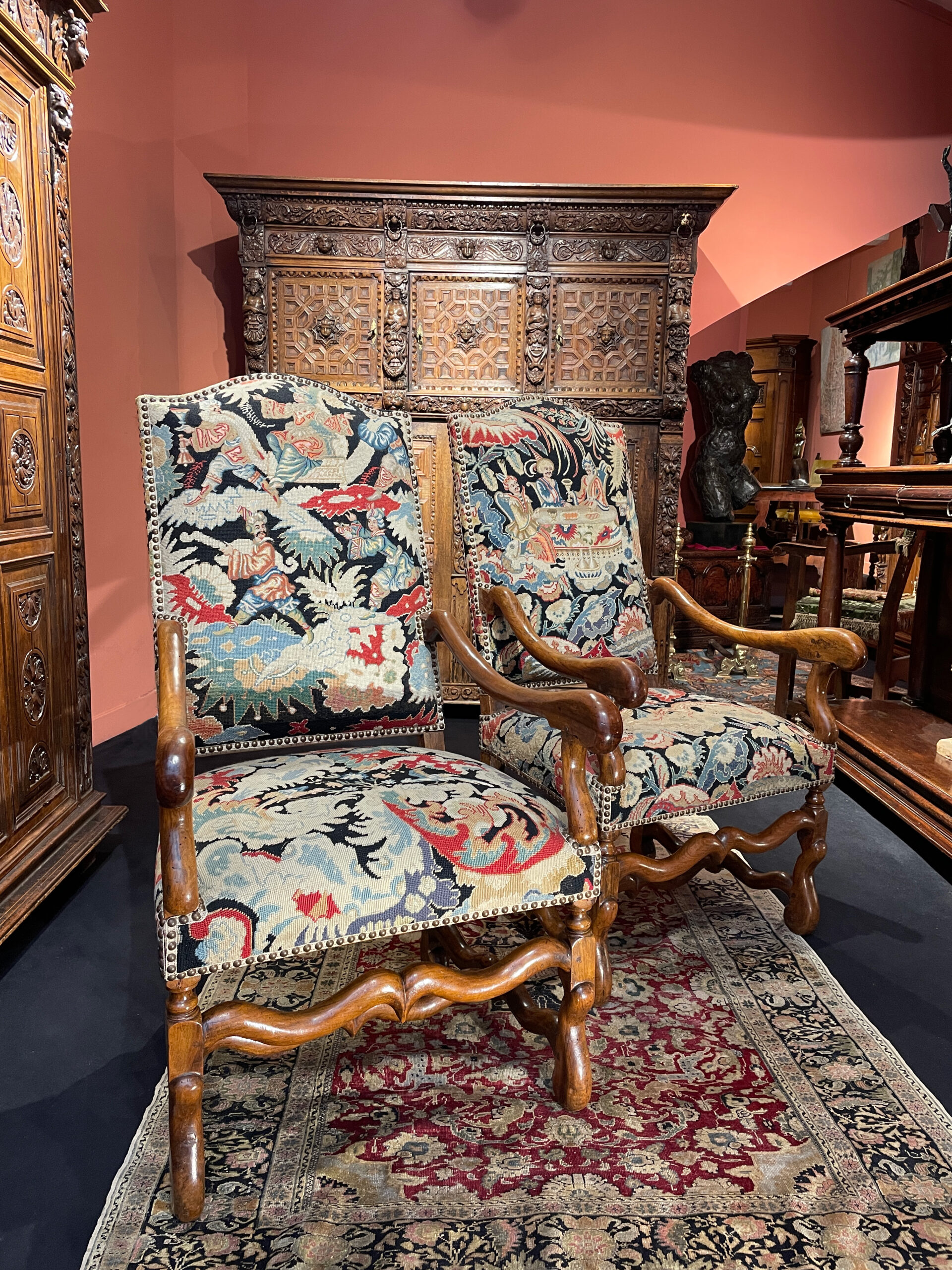 Les sièges, avec leur dossier en léger devers, et en chapeau de gendarme, sont typiques de l’époque, et présentent une tapisserie aux petits points aux décors de fleurs et d’oiseaux sur les assises, et une turquerie avec des personnages élégamment vêtus sur les dossiers.