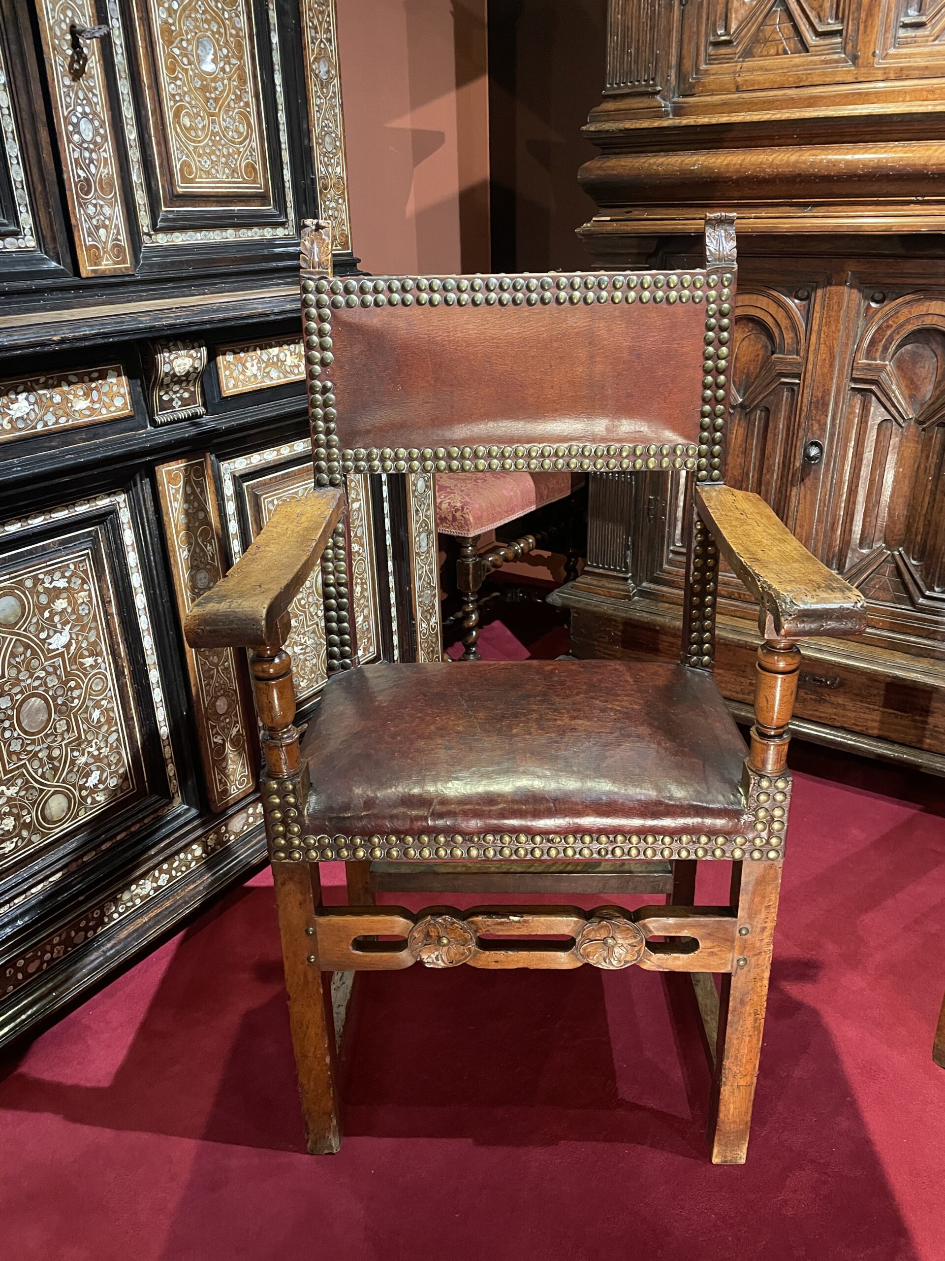 Le dossier et l’assise ont conservés leur garniture en cuirs d’origine, fixée par plusieurs rangées de clous en laiton.