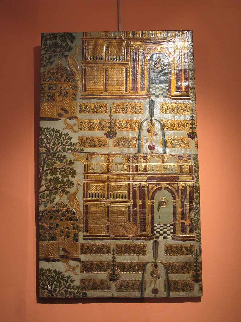 A gauche de ce bâtiment figure un petit pavillon circulaire à ouverture en plein cintre sur lequel est perché un paon. Le feuillage d’un arbre le couvre en partie abritant un oiseau. A droite du bâtiment un arbre aux fruits ronds et rouge du même feuillage.