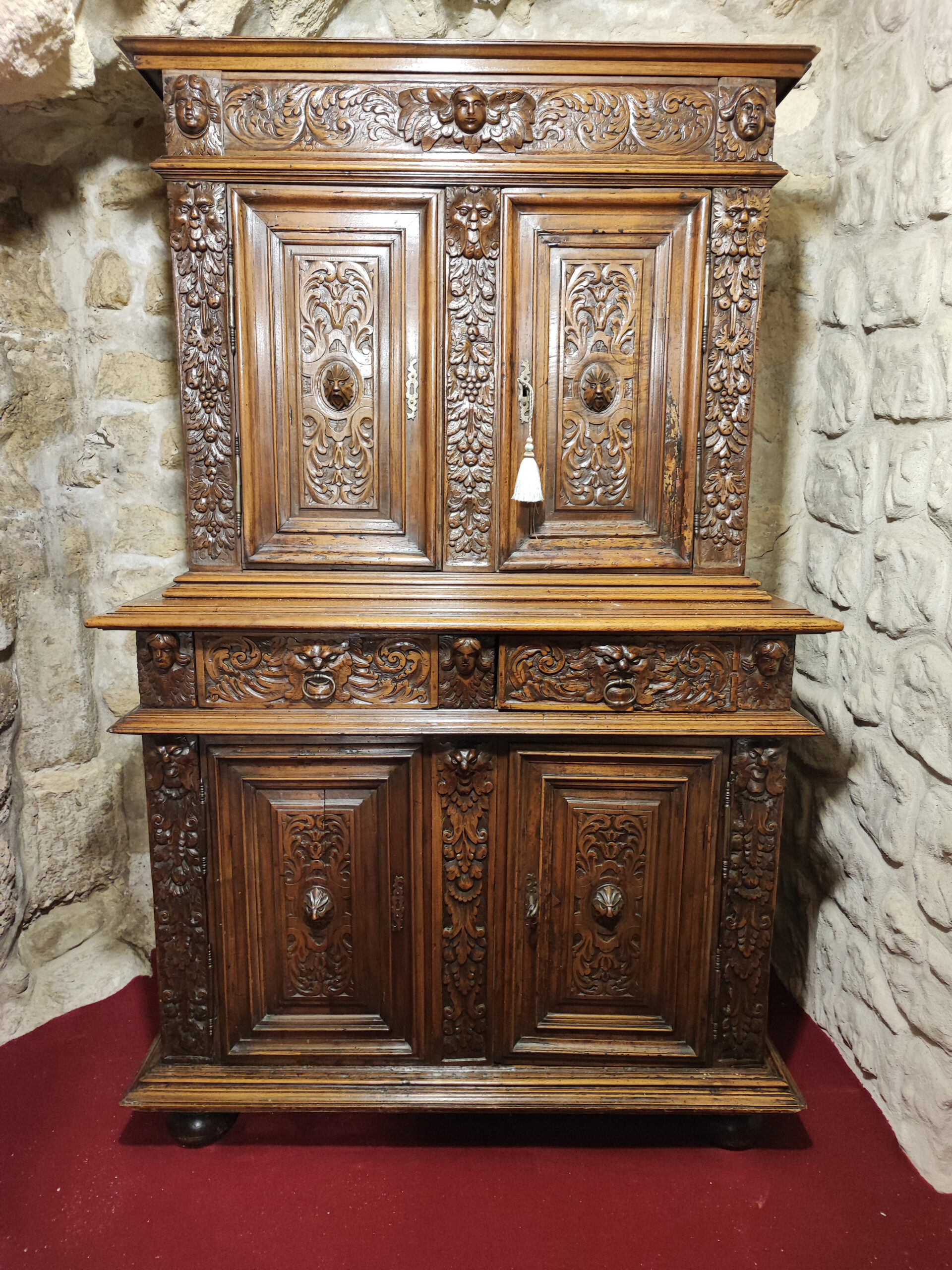 Ce cabinet s’illustre par son élégance et par la qualité de sa sculpture. Les motifs présents sur les frises et sur les panneaux sont variés et l’ornementation est travaillée avec raffinement.