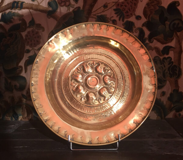 Il présente un dôme central, appelé ombilic et offre un décor au repoussé tout à fait spécifique de ces ateliers. Elaboré selon un schéma traditionnel, son ombilic est orné de godrons, son bassin de belles lettres gothiques allemandes sur deux registres et son marli d’un décor estampé de motifs de fleurons. Enfin, pour des raisons de solidité, le bord de ce plat est replié sur un fil de fer, comme il était d’usage de les fabriquer en Allemagne.