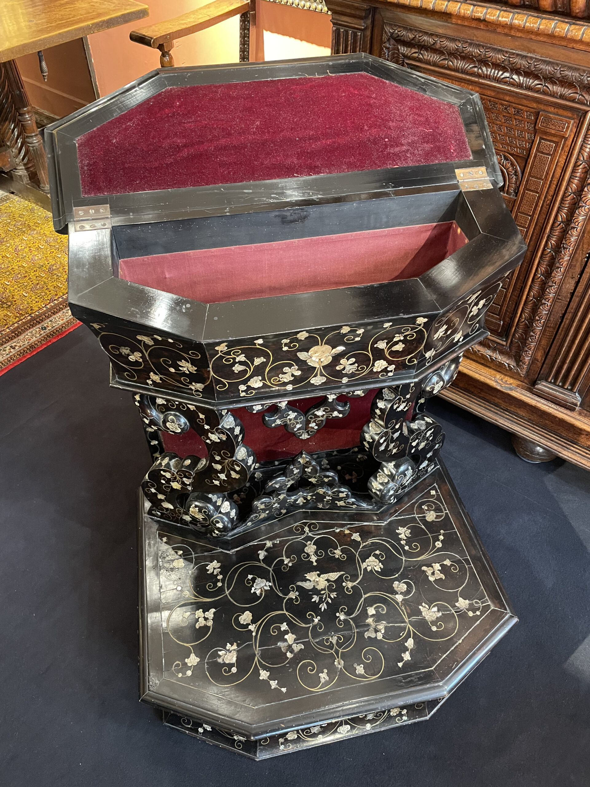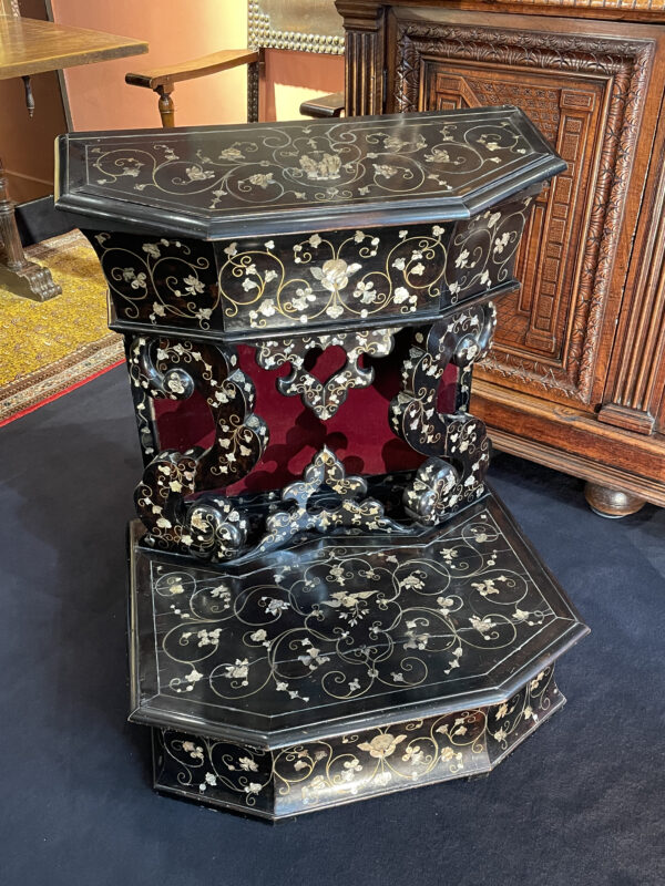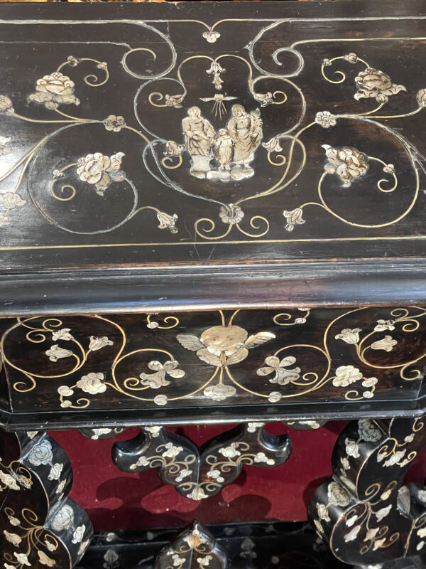 Cette pièce unique est composée d’une trame en bois noirci. L’entiéreté de la surface du prie-dieu est ornée d’incrustations de nacres représentant des puttis ailés, ou des motifs floraux reliés entre eux par des rinceaux de cuivre.