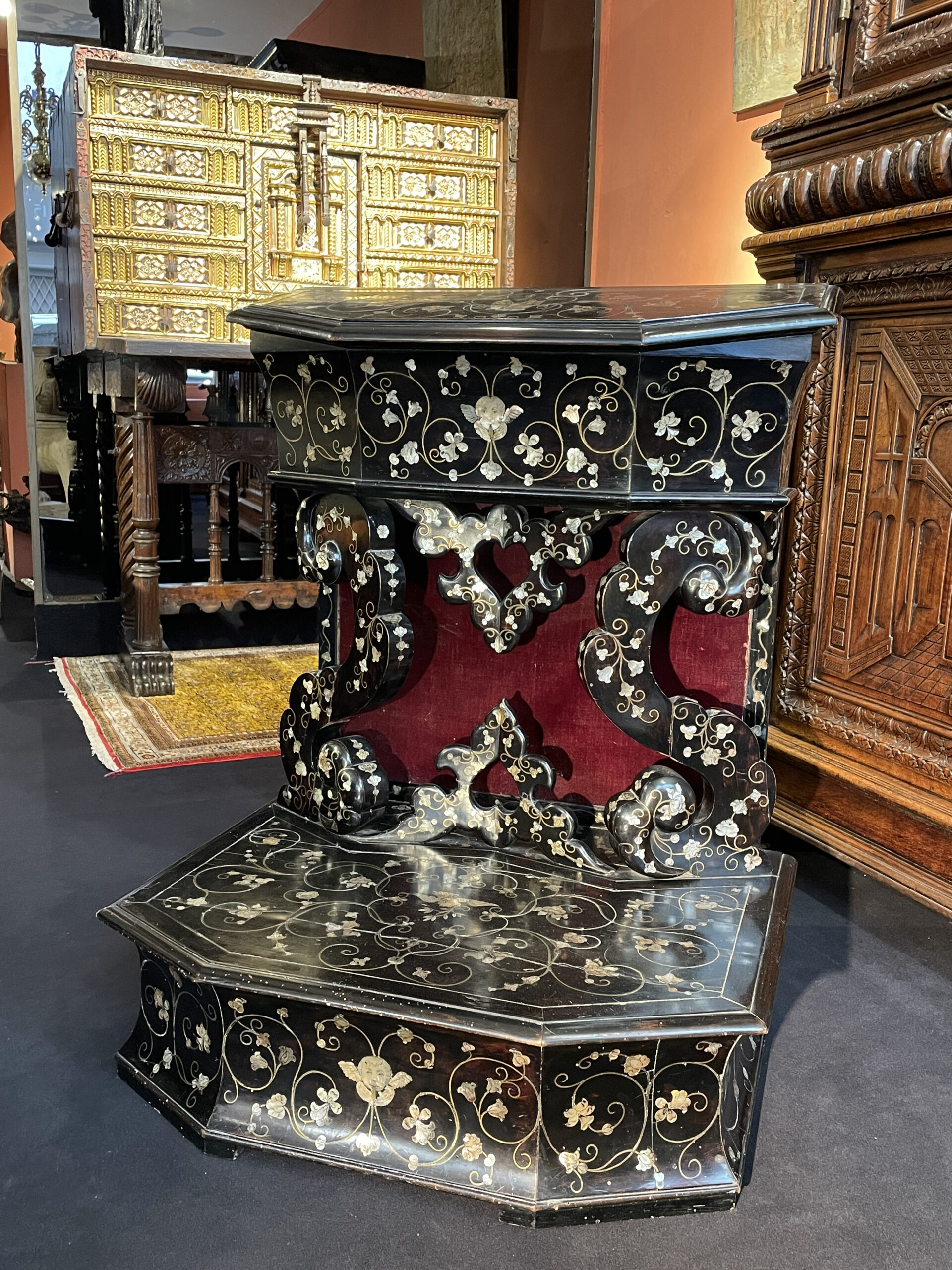 Cet impressionnant prie-dieu en bois noirci est un parfait exemple du raffinement du travail des artistes vénitiens du XVIIème siècle.