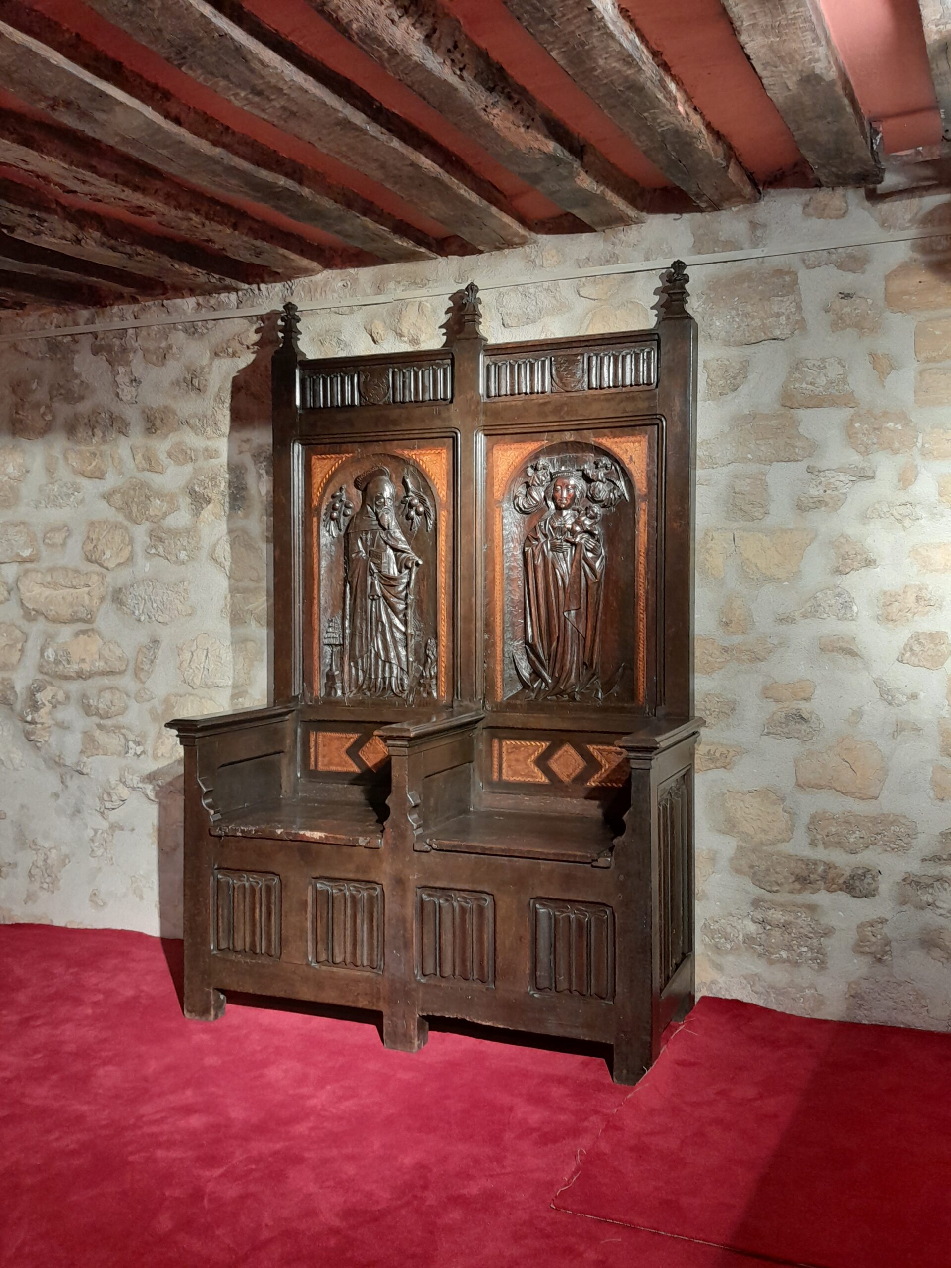 Cette cathèdre double en bois de noyer était probablement destinée à une abbatiale, au regard de son décor sculpté.