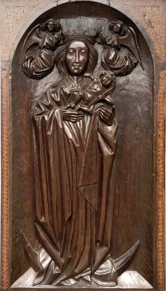 De fait, la Vierge est couronnée par des anges, elle foule l’astre lunaire, tout en serrant le Christ contre elle. Cette représentation de la Vierge de l’Apocalypse se constitue réellement en Occident, entre le Moyen-Âge et la Renaissance, et elle prend son essor au début du XVIème siècle.