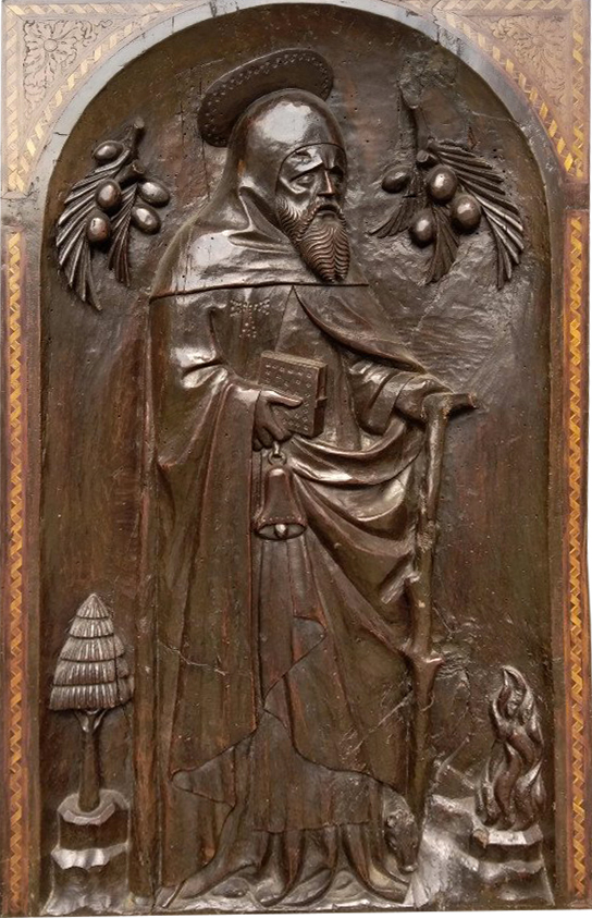 Ce bas-relief ne présente pas une scène précise de la vie du saint, mais elle est une figure canonique qui reprend chaque attribut hagiographique.