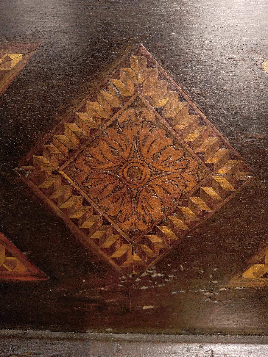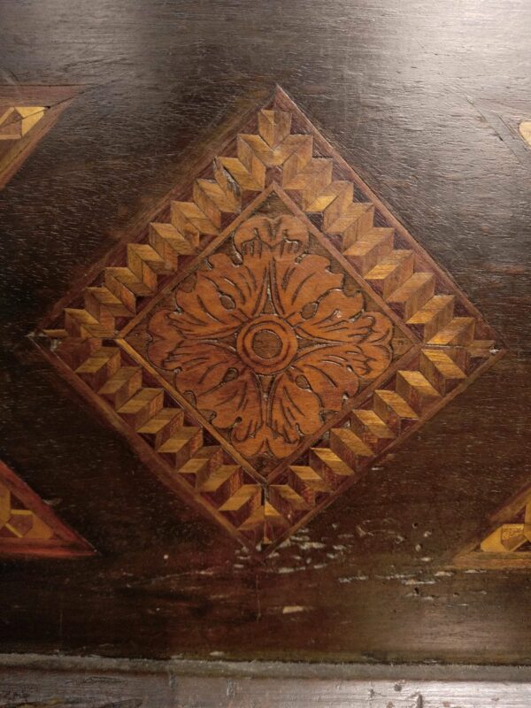 Le niveau intermédiaire est scandé par trois accotoirs droits et pleins. La partie basse du dossier est agrémentée de deux panneaux aux décors marquetés à « tarsia certosina » pour les motifs géométriques. Cette technique, aussi appelé « incrustation dans la masse » consiste à creuser une cavité dans le bois pour y incruster des éléments décoratifs. Ces panneaux sont encadrés par un procédé de marqueterie, dite « tarsia a toppo », qui consiste à créer des filets ou des bandes de placage.