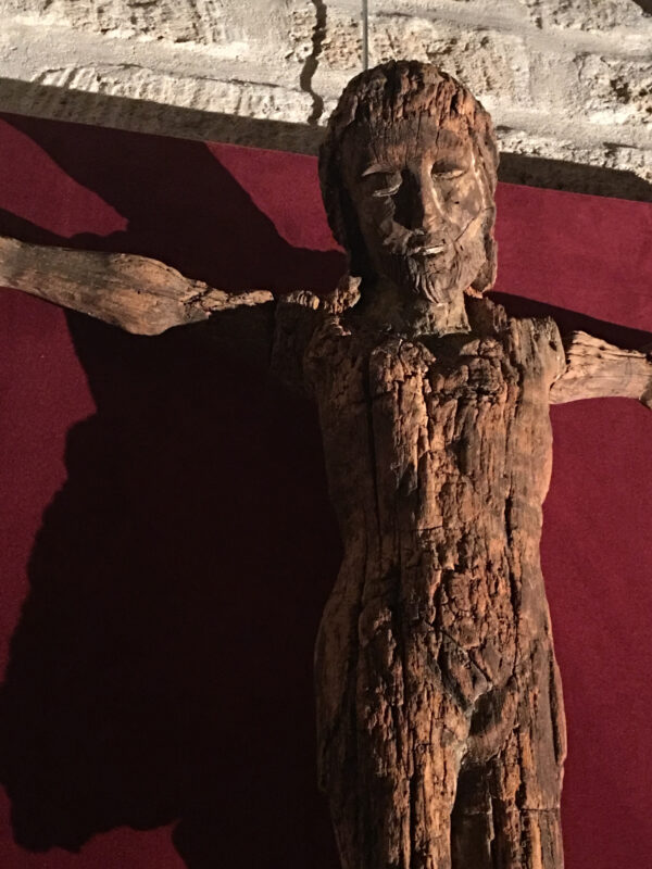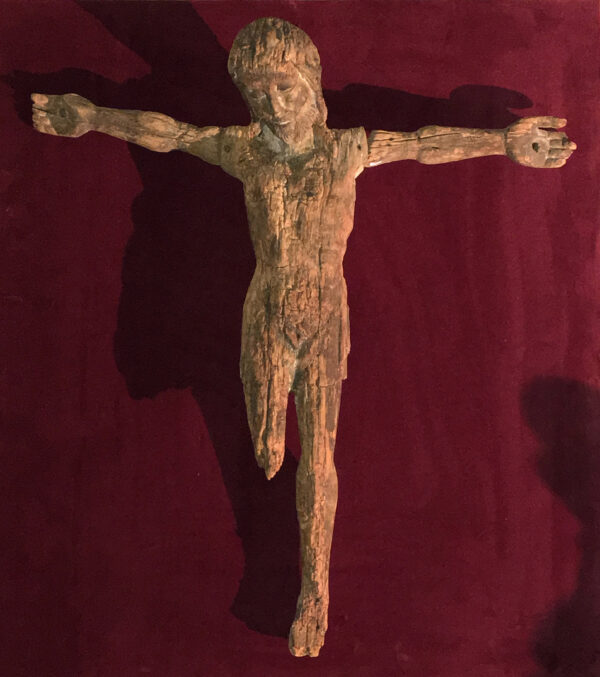 Ce Christ en bois porte les stigmates du temps, sans que cela n’altère sa grâce ni amoindrisse son intérêt.