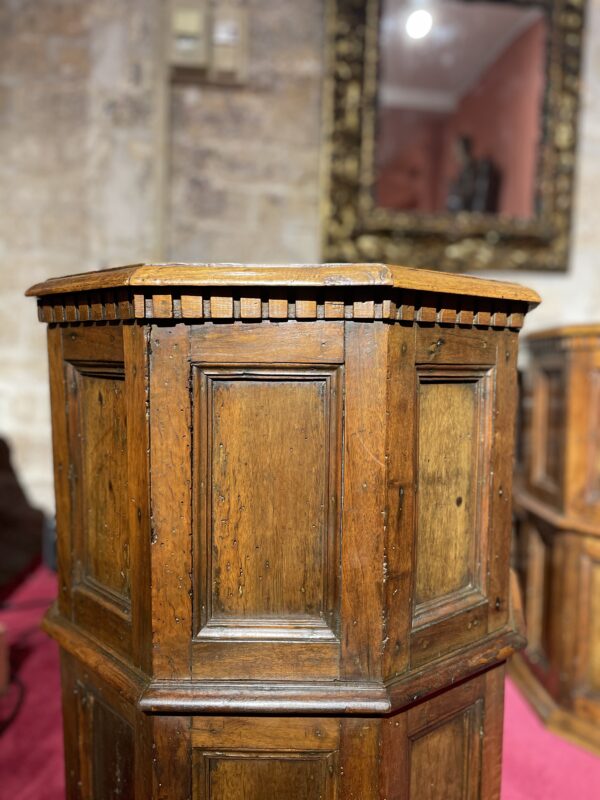 Placé sur une plinthe moulurée, il possède un dossier à sept côtés formé de planches verticales cernées d’un cadre mouluré. L’accoudoir forme la partie supérieure du siège dont il fait le tour. Il est souligné par une frise de denticules. L’assise est formée d’un panneau heptagonal situé au-dessus d’un compartiment, accessible par une porte centrale, flanquée de deux panneaux.
