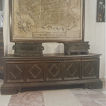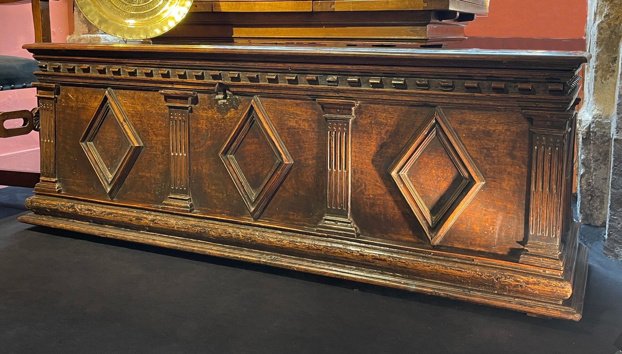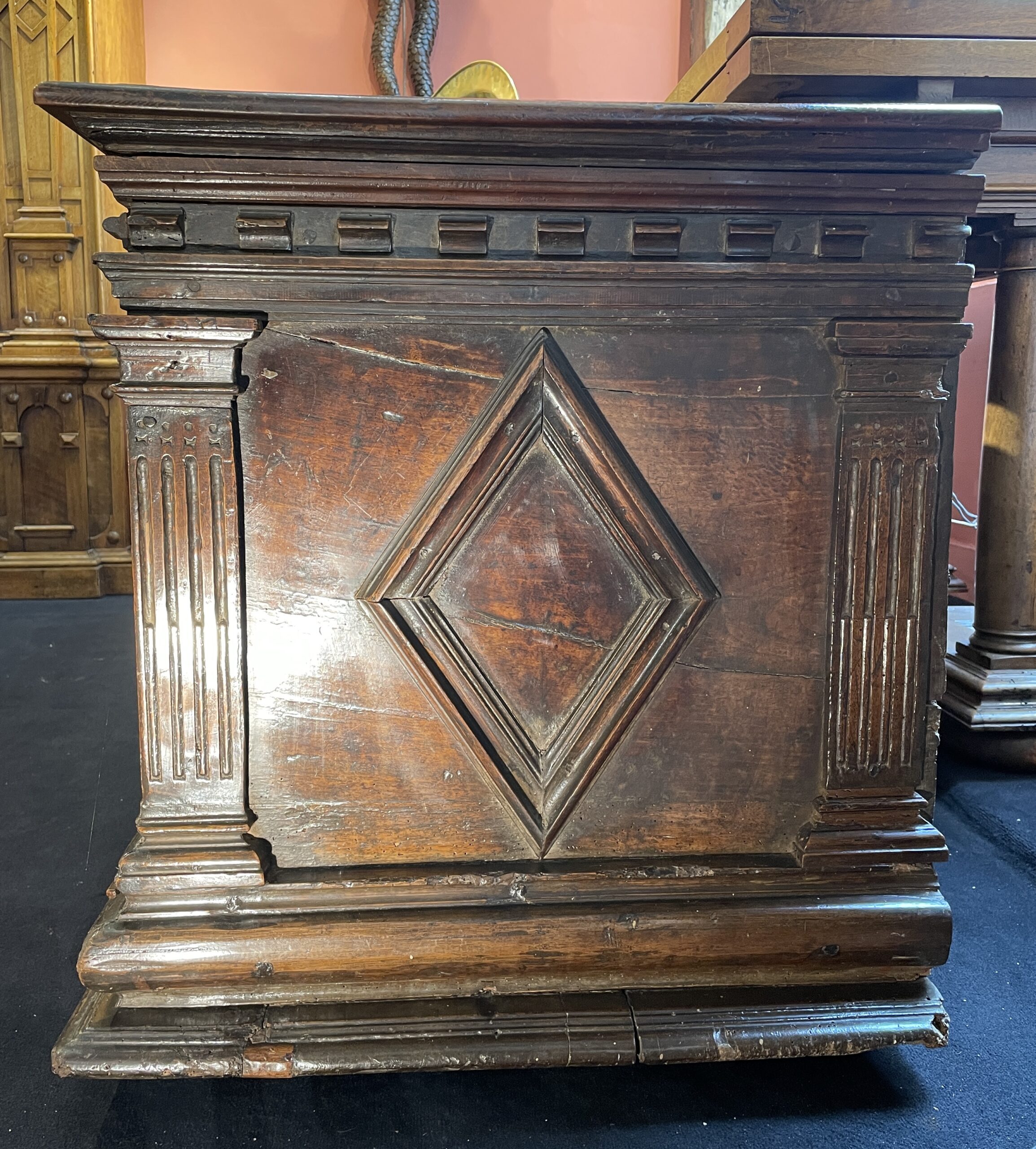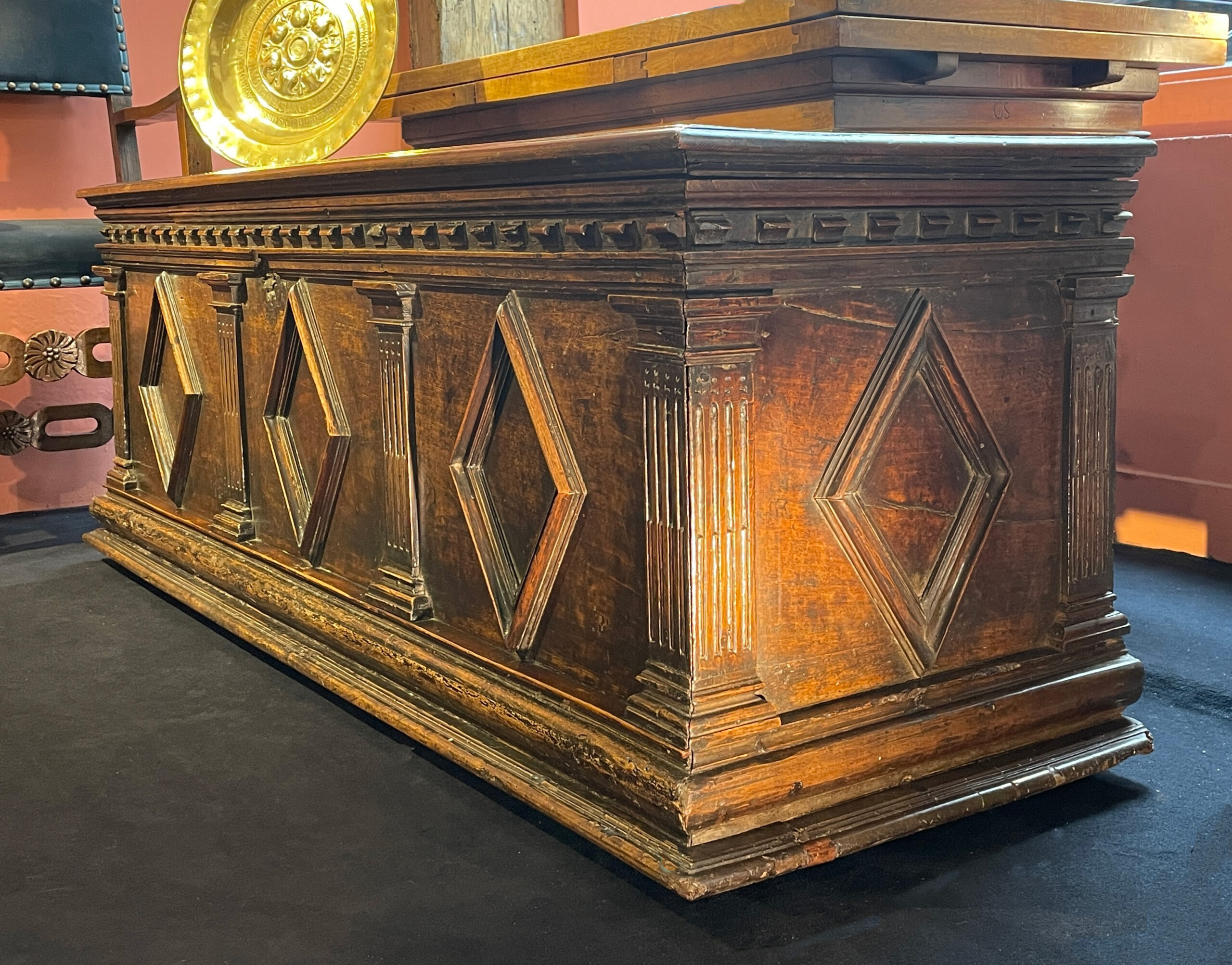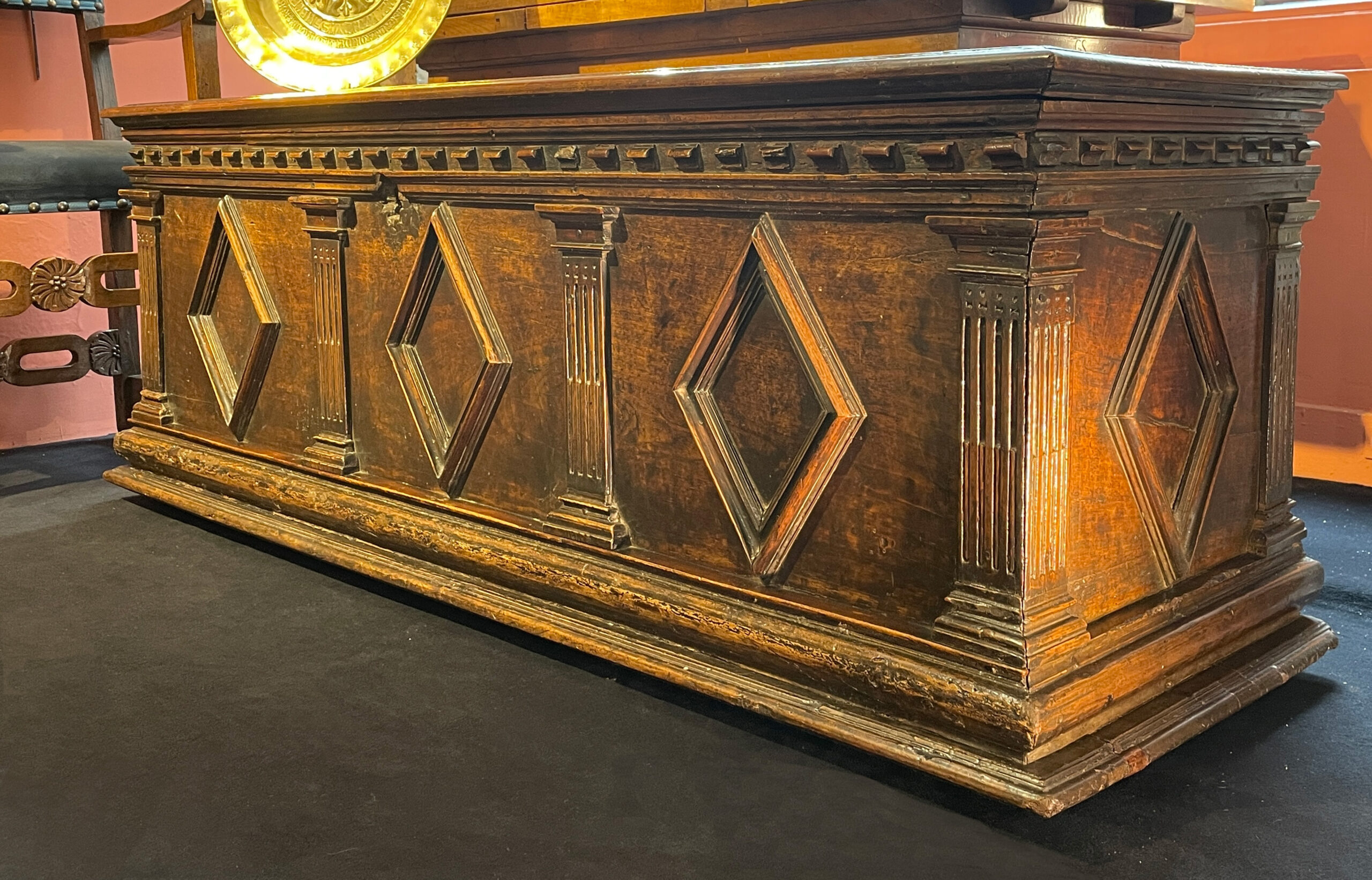 La face avant de la Cassone est scindée de quatre pilastres cannelés et rudentés jusqu’à mi-hauteur, puis couronné d’un chapiteau dorique. Entre chaque pilastre, apparait un beau motif de losange mis en relief par un cadre fait de multiples moulures.