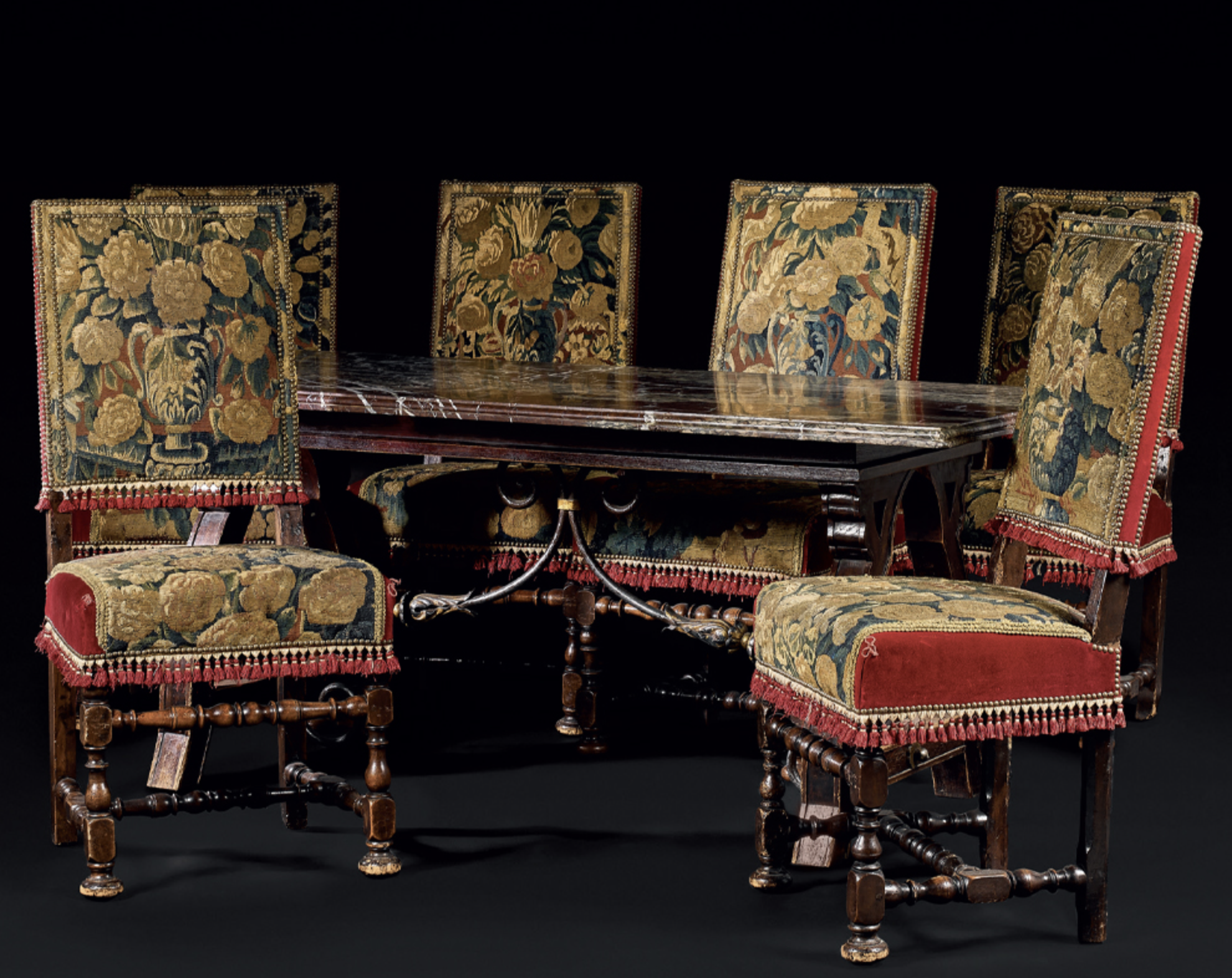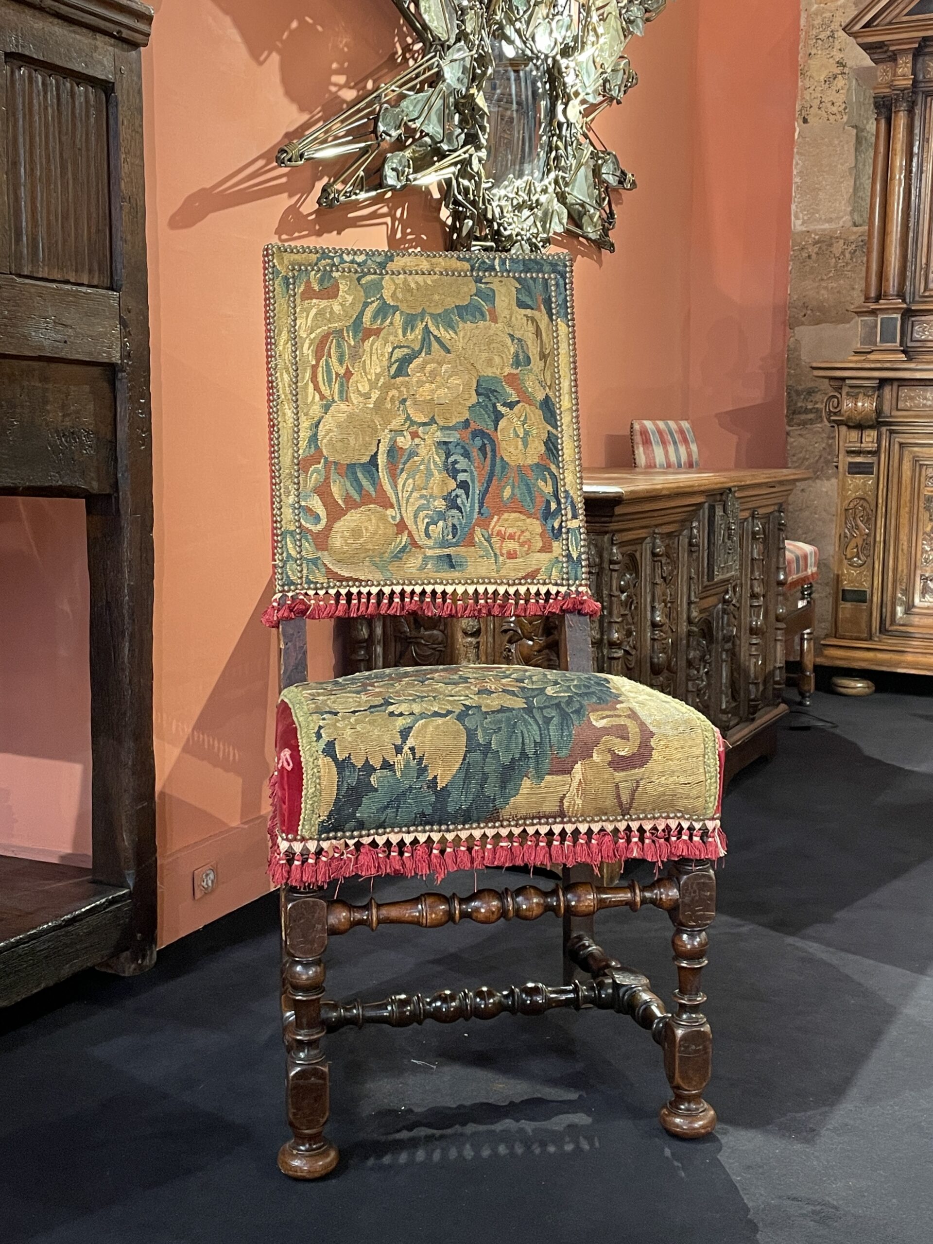 Ces chaises garnies d’une tapisserie du XVIIe siècle présentent un piètement de grande qualité.