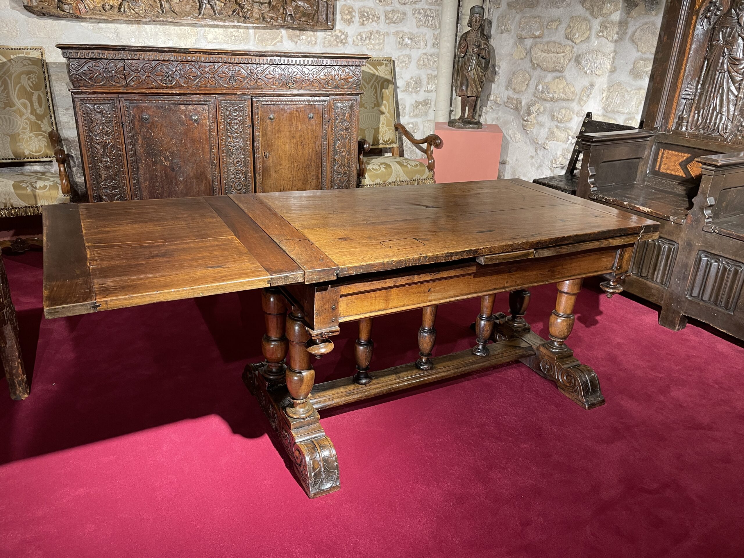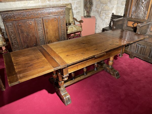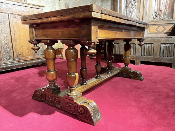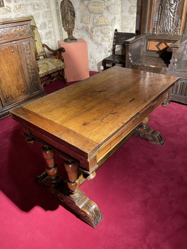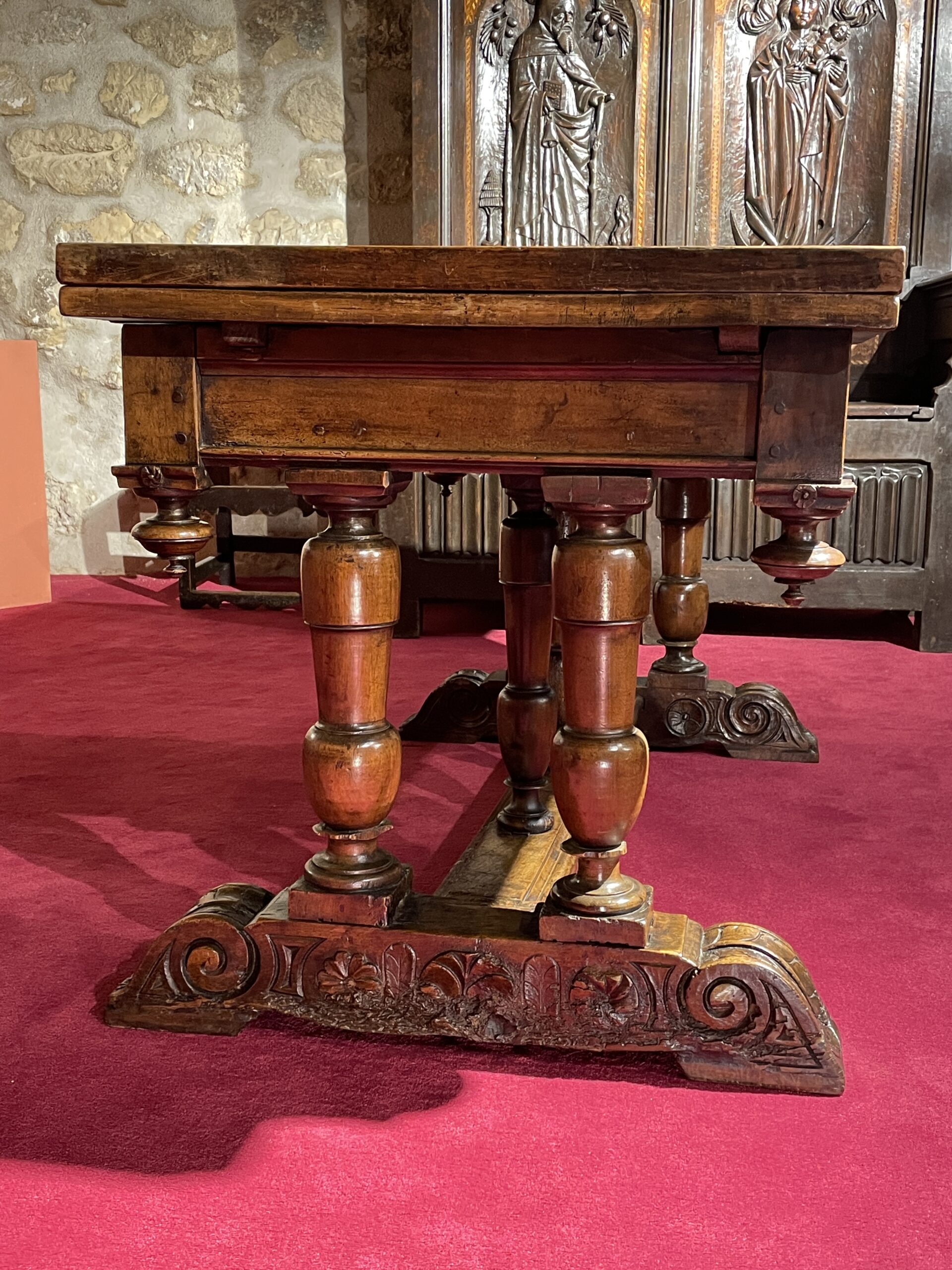 Cette table à la décoration sobre et élégante est un bon exemple de la ligne générale et des nouvelles découvertes, mises en place à la Renaissance, particulièrement en France où la décoration restera plus maîtrisée qu’en Italie. Indépendamment de son dessin, la structure et le montage de cette belle table sont caractéristiques de cette époque : de deux épais patins, réunis par une large entretoise moulurée, montent les trois balustres solidement tournés, sur lesquels repose la large ceinture moulurée qui porte le plateau à double épaisseur.