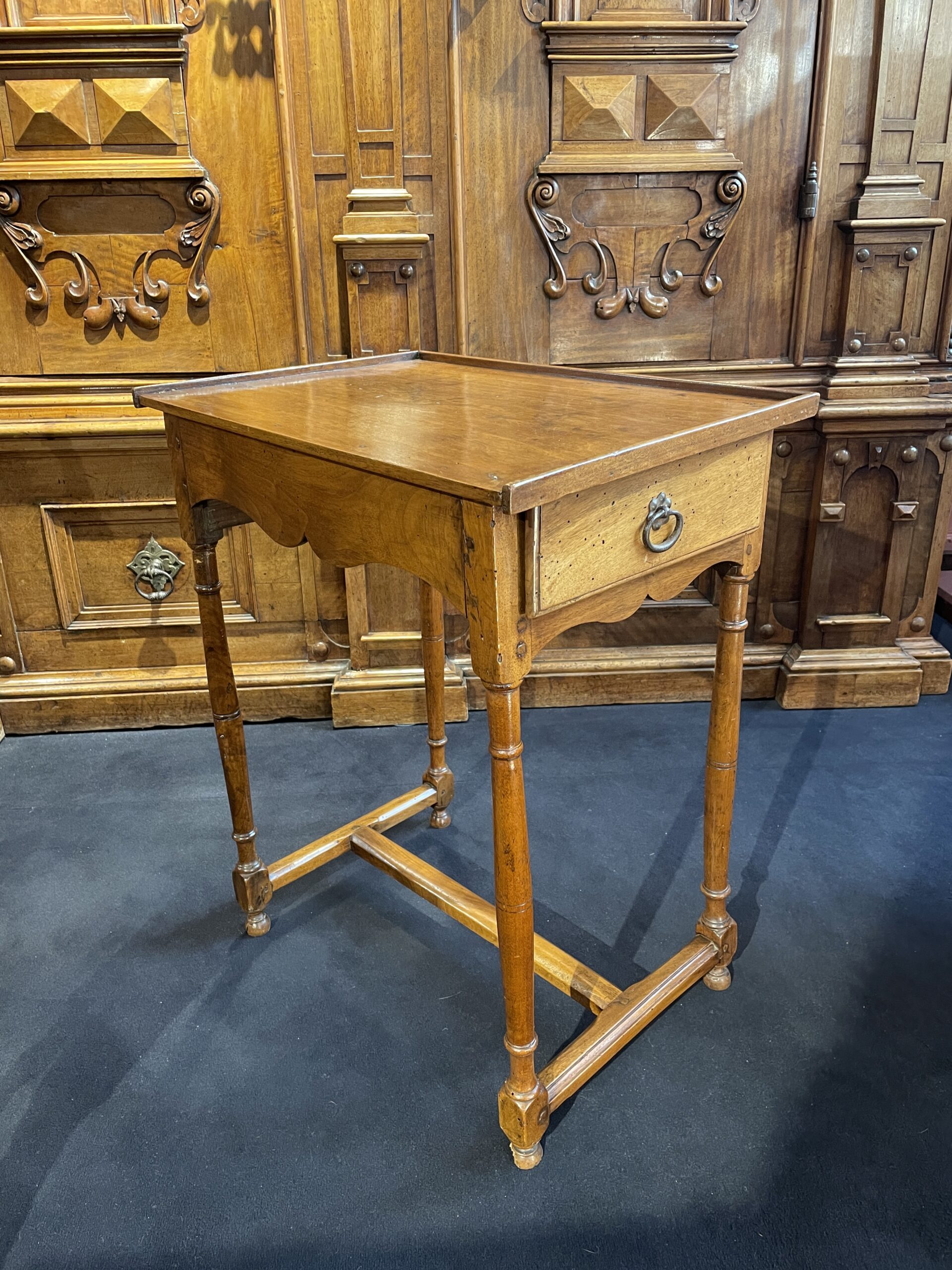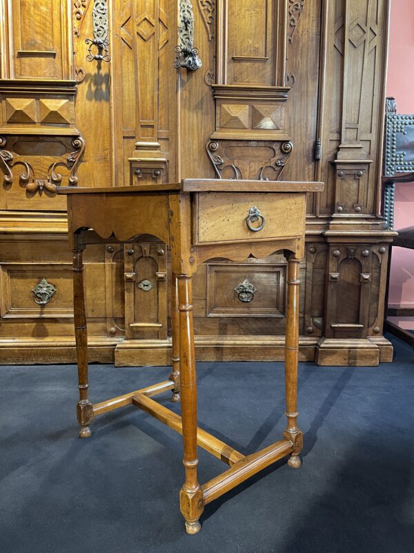 Il est formé de quatre colonnes réunies par une entretoise en H moulurée. La ceinture découpée en accolade ouvre à un tiroir en ceinture.