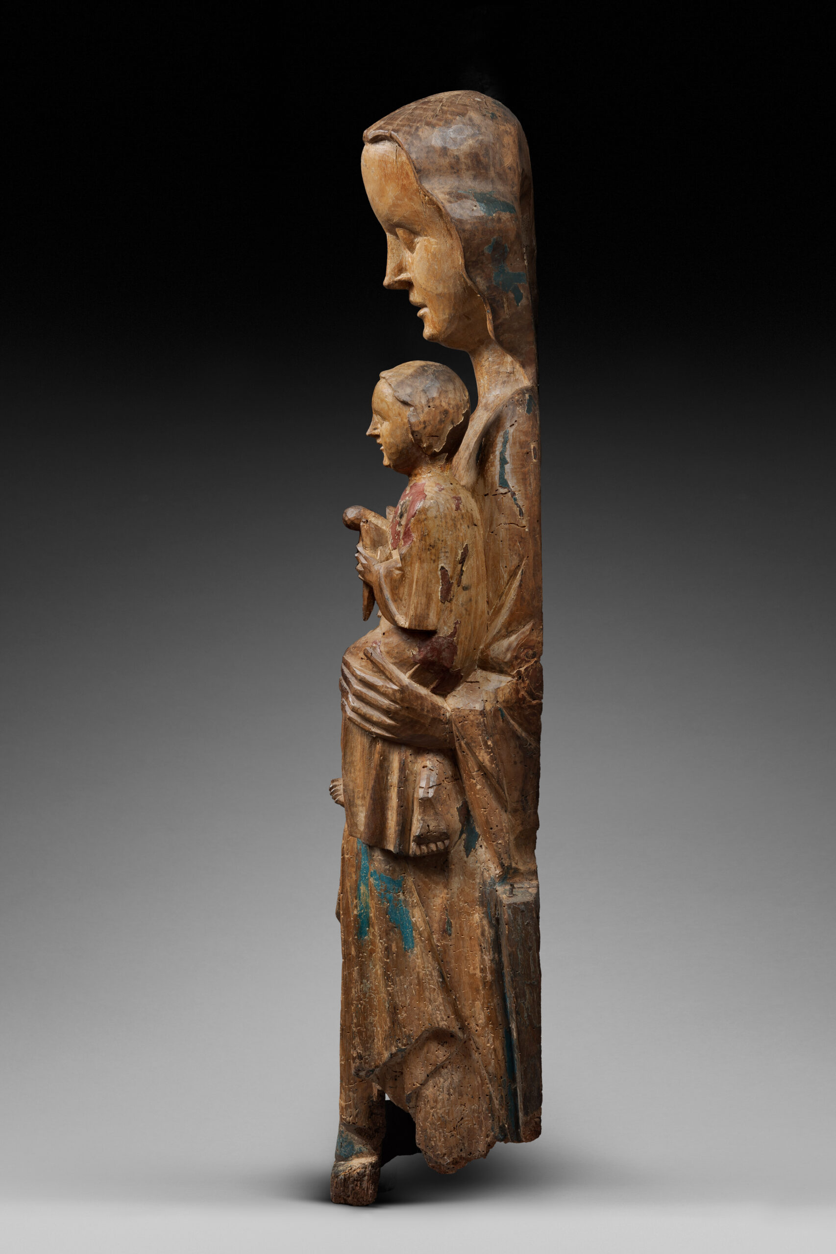 Ce groupe de la Vierge et l’Enfant à l’oiseau conserve encore une posture droite et hiératique, le regard projeté loin devant. Néanmoins, l’Enfant se décentre nettement sur le côté gauche et esquisse un sourire emplit d’humanité. Ces quelques caractéristiques, le drapé souple, les yeux larges et le nez droit sont autant d’indices qui permettent de dater cette Vierge allemande à l’extrême fin du XIIIe siècle ou au tout début du siècle suivant.