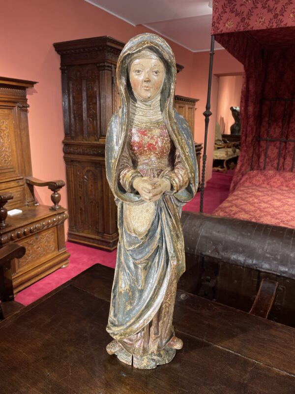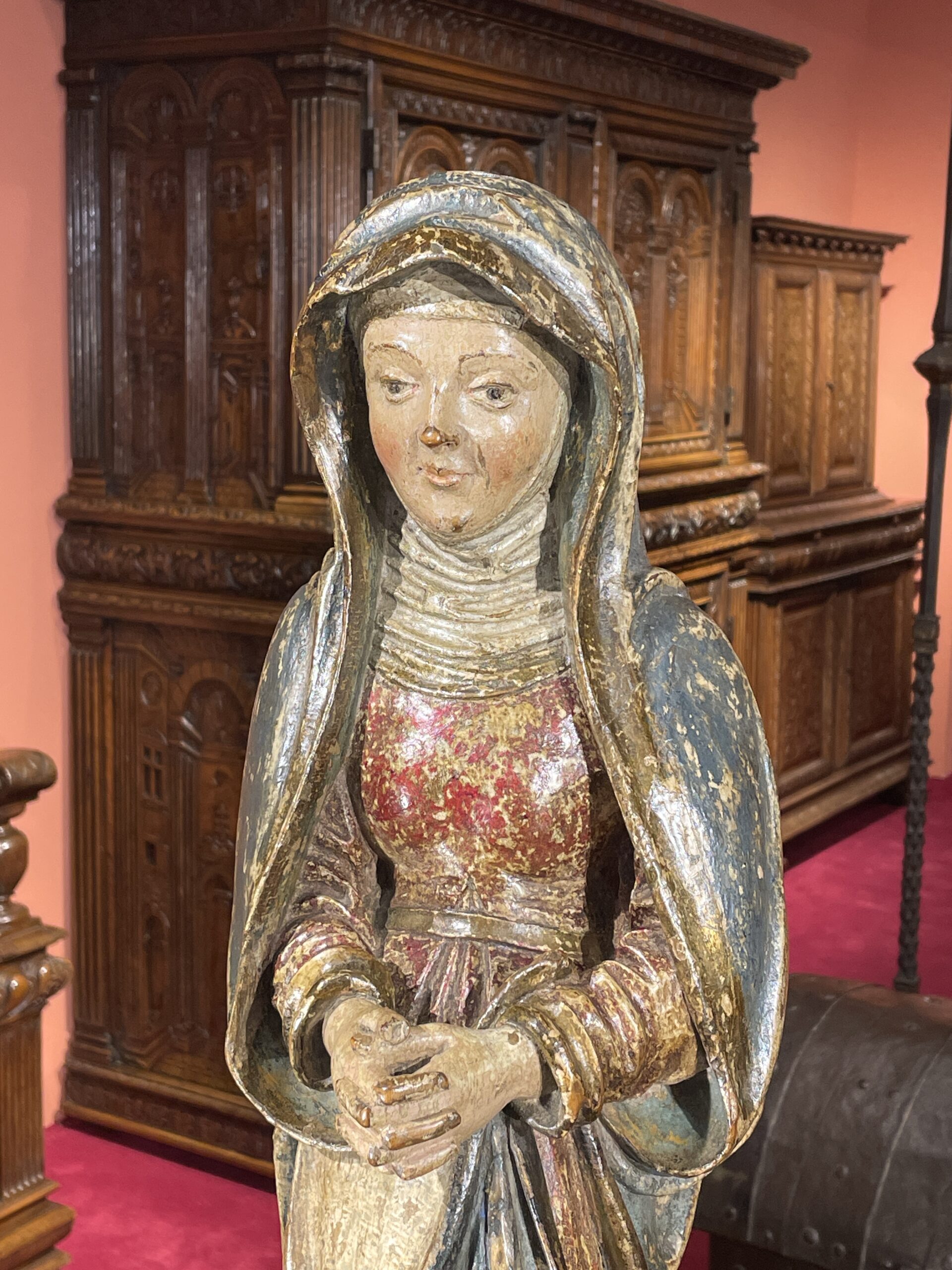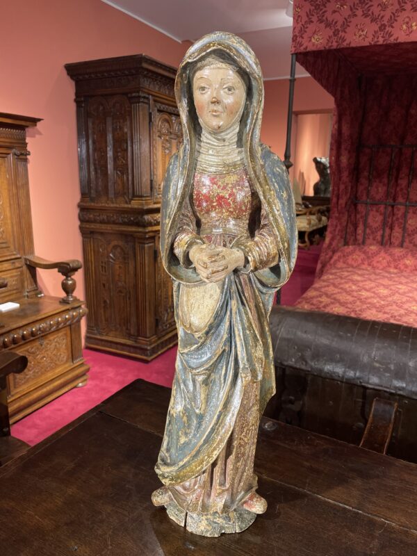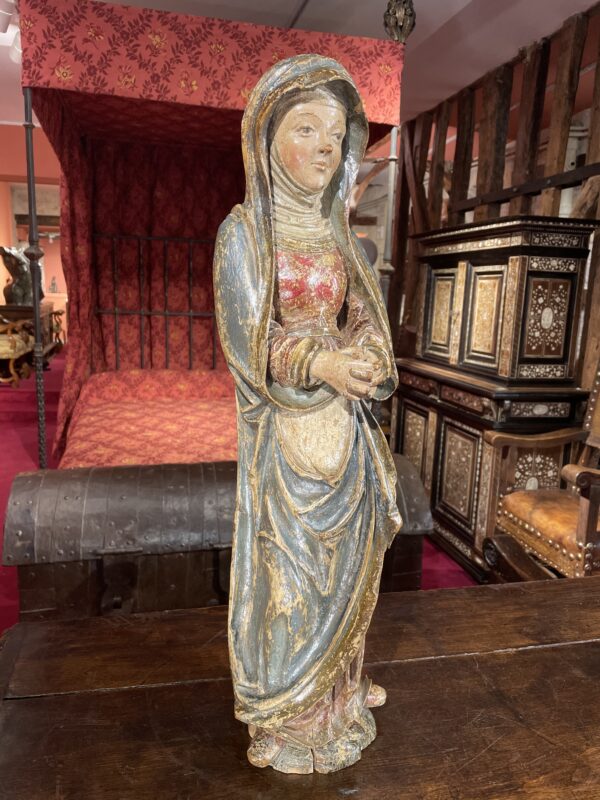 Entièrement polychromée, le rouge de la robe laisse apparaître un fond argenté des plus raffinés. L’ensemble amène de la douceur et de l’élégance à cette Vierge de Calvaire qui faisait pendant à Saint Jean l’Evangéliste, dans une scène de crucifixion.