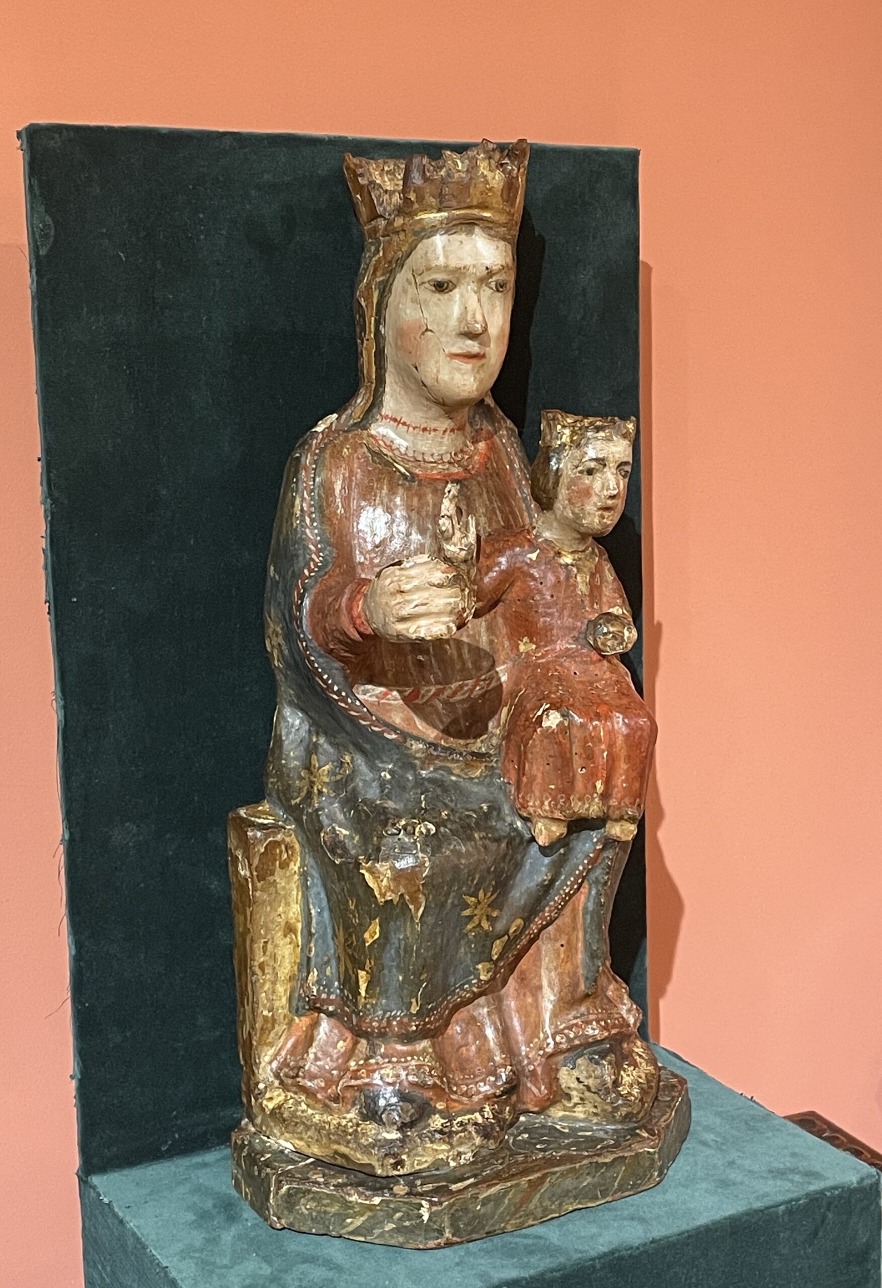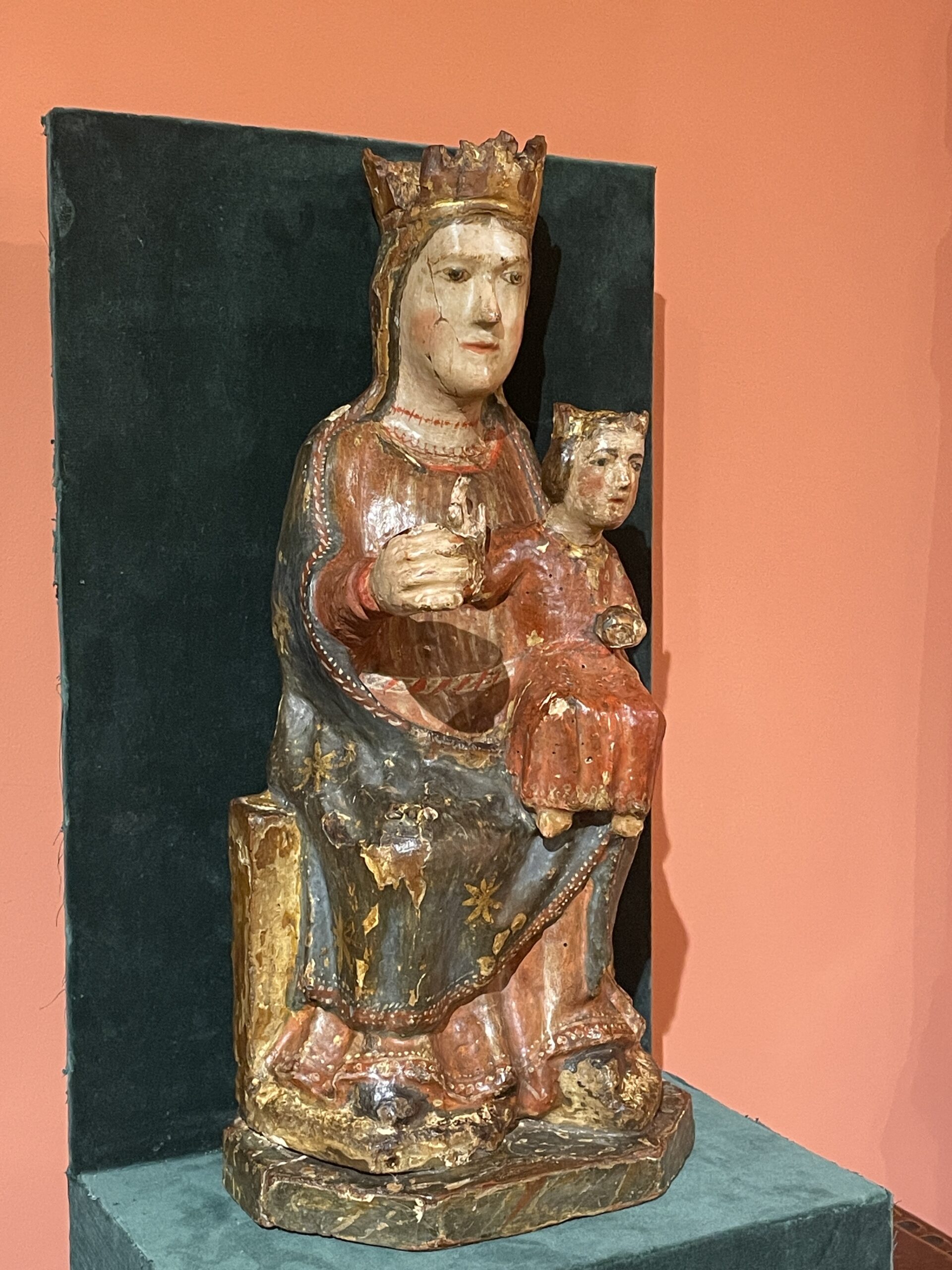 La Vierge couronnée est assise dans une attitude frontale, sur une sedia, comme cela est d’usage au XIIIème siècle pour les Sedes Sapientae. Elle est le trône de la Sagesse incarnée en son fils Jésus qu’elle présente à la chrétienté. De la main droite, elle tient une pomme, tandis que de la gauche elle présente l’enfant Jésus, assis sur son genou gauche, dans une même attitude frontale.